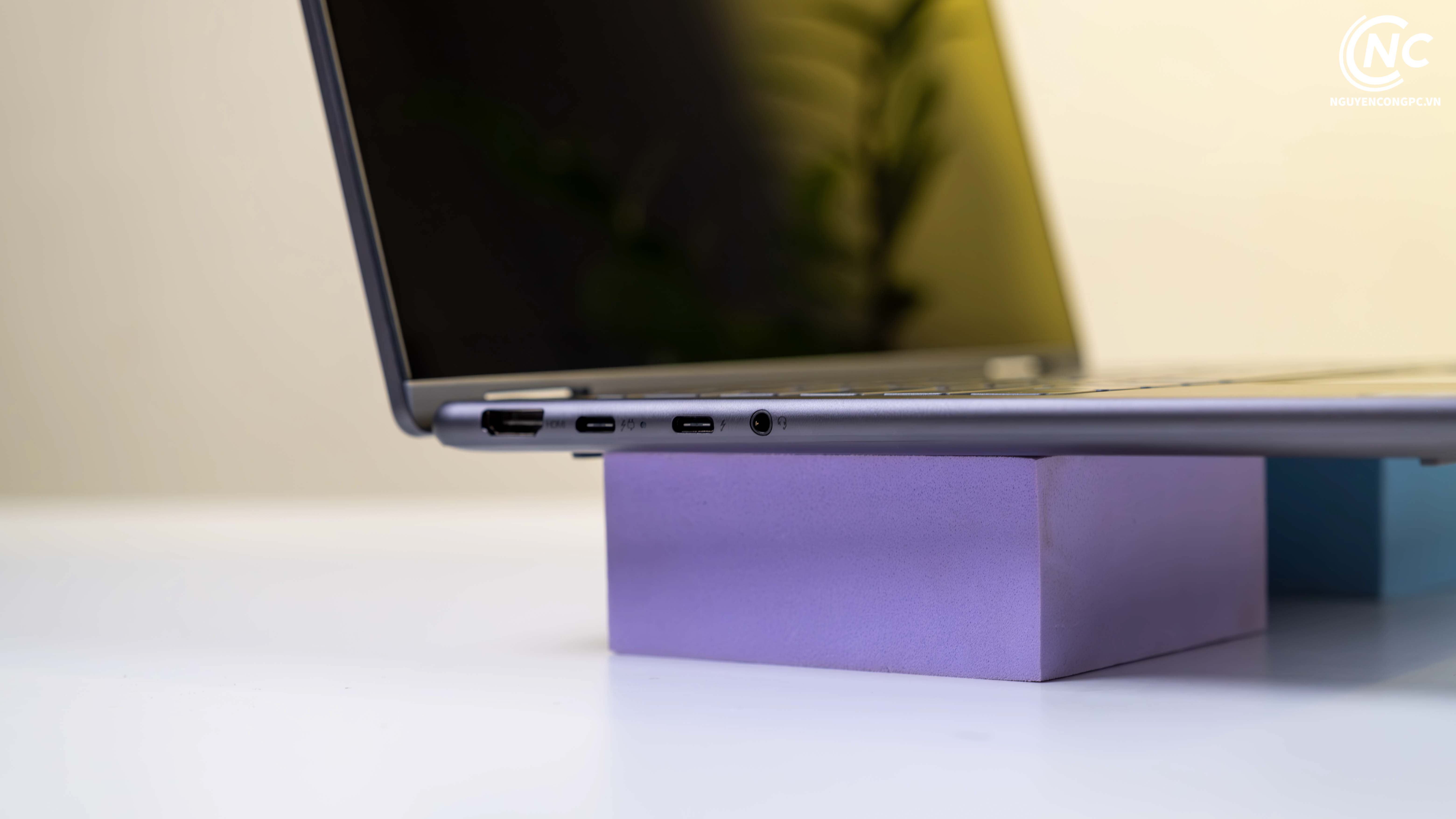 Cạnh trái bao gồm: 1x HDMI 2.1, 2x USB Type-C (with DisplayPort and Power Delivery), 1x headphone/microphone combo