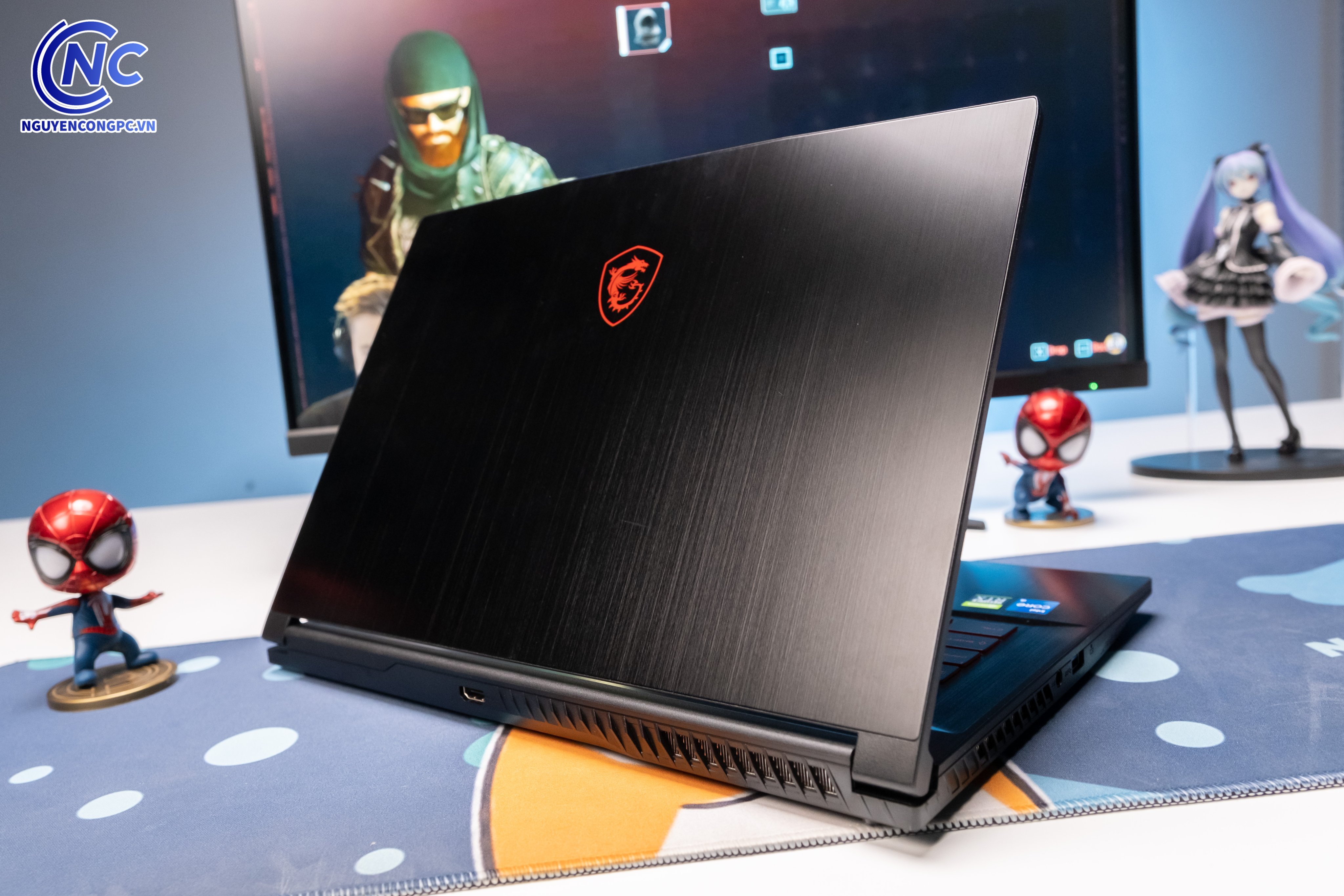 Toàn thân MSI GF63 có màu đen chủ đạo với những điểm nhấn màu đỏ như logo MSI. Phần quạt thông gió hình chữ X ẩn dưới thân máy, tạo nên sự thanh thoát và liền khối trong thiết kế tổng thể.