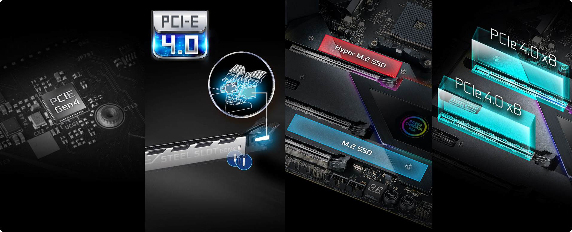 Chipset AMD B550 làm cho PCIe® khả thi cho bất kỳ ai muốn hiệu suất, băng thông và tốc độ cao hơn. Bộ tạo xung nhịp bên ngoài PCIe 4.0 cung cấp hiệu suất ép xung PCIe 4.0 tốt hơn.
