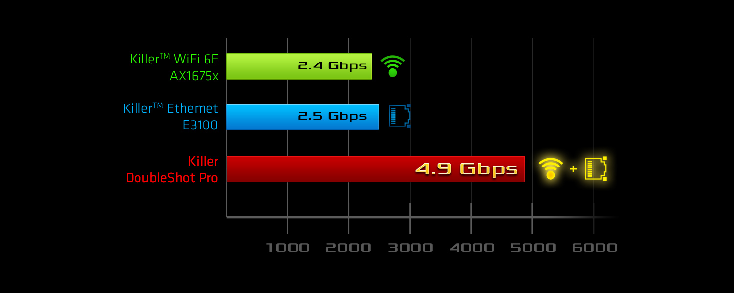 | LAN | - 802.11ax Wi-Fi 6E Module - Supports IEEE 802.11a/b/g/n/ax - Supports Dual-Band 2x2 160MHz with extended 6GHz band support* - 2 antennas to support 2 (Transmit) x 2 (Receive) diversity technology - Supports Bluetooth 5.3 + High speed class II - Supports MU-MIMO - Supports Killer LAN Software - Supports Killer DoubleShot™ Pro |
