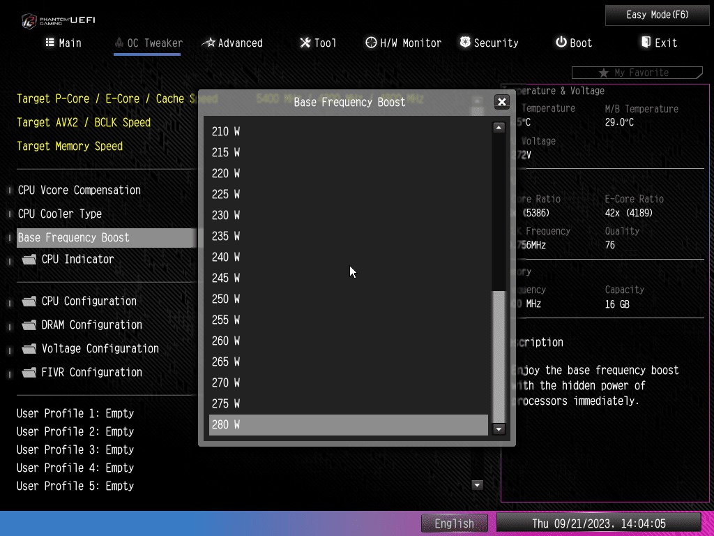 Ngoài việc cho phép lựa chọn từng mục theo tản nhiệt sử dụng, ASRock cũng áp dụng công nghệ Base Frequency Boost với mức cao nhất là 280W, đồng thời vẫn cho phép người dùng tùy chỉnh các giá trị PL1/PL2 lên tới mức vô hạn.