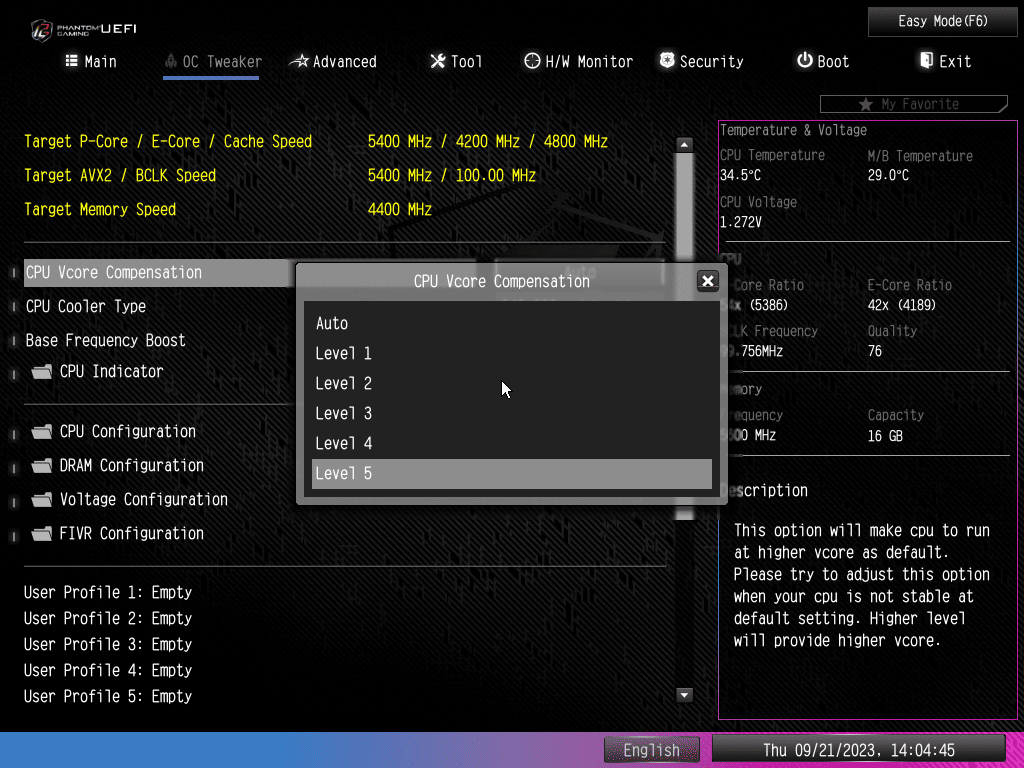 Tab OC Tweker cho phép tinh chỉnh nhiều thứ liên quan tới CPU, RAM và các thành phần khác. ASRock chia menu OC Tweaker rất trực quan để người dùng dễ dàng tinh chỉnh hệ thống, trong đó được chia thành các mục thành CPU Configuration, DRAM Configuration, Voltage Configuration và FIVR Configuration. Ngoài ra, hiện tại có tùy chọn CPU Vcore Compensation (LLC), lựa chọn CPU Cooler Typer và mục điều chỉnh điện năng hoạt động của vi xử lý theo giá trị PL tức Base Frequency Boost.