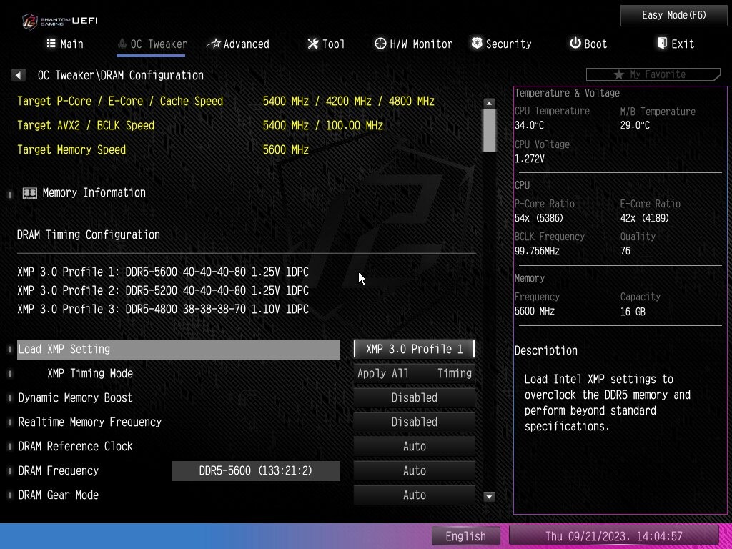 Với bo mạch chủ ASRock cho Intel, chúng ta có thể ép xung bộ nhớ bằng cấu hình XMP được áp sẵn từ NSX bộ nhớ bằng cách chọn chế độ XMP Profile trong cài đặt BIOS. Từ Chế độ XMP, người dùng cũng thể chọn áp dụng tất cả Timing phụ được ghi trong cấu hình XMP hoặc chỉ Timing chính như Độ trễ CAS. Khi giá trị cài đặt XMP Profile trong BIOS được đặt thành Auto, lúc này xung nhịp của bộ nhớ sẽ tự động nhận diện theo chuẩn JEDEC. JEDEC hiện tại cao nhất của DDR4 là đến 3200MHz và 5600MHz đối với DDR5.