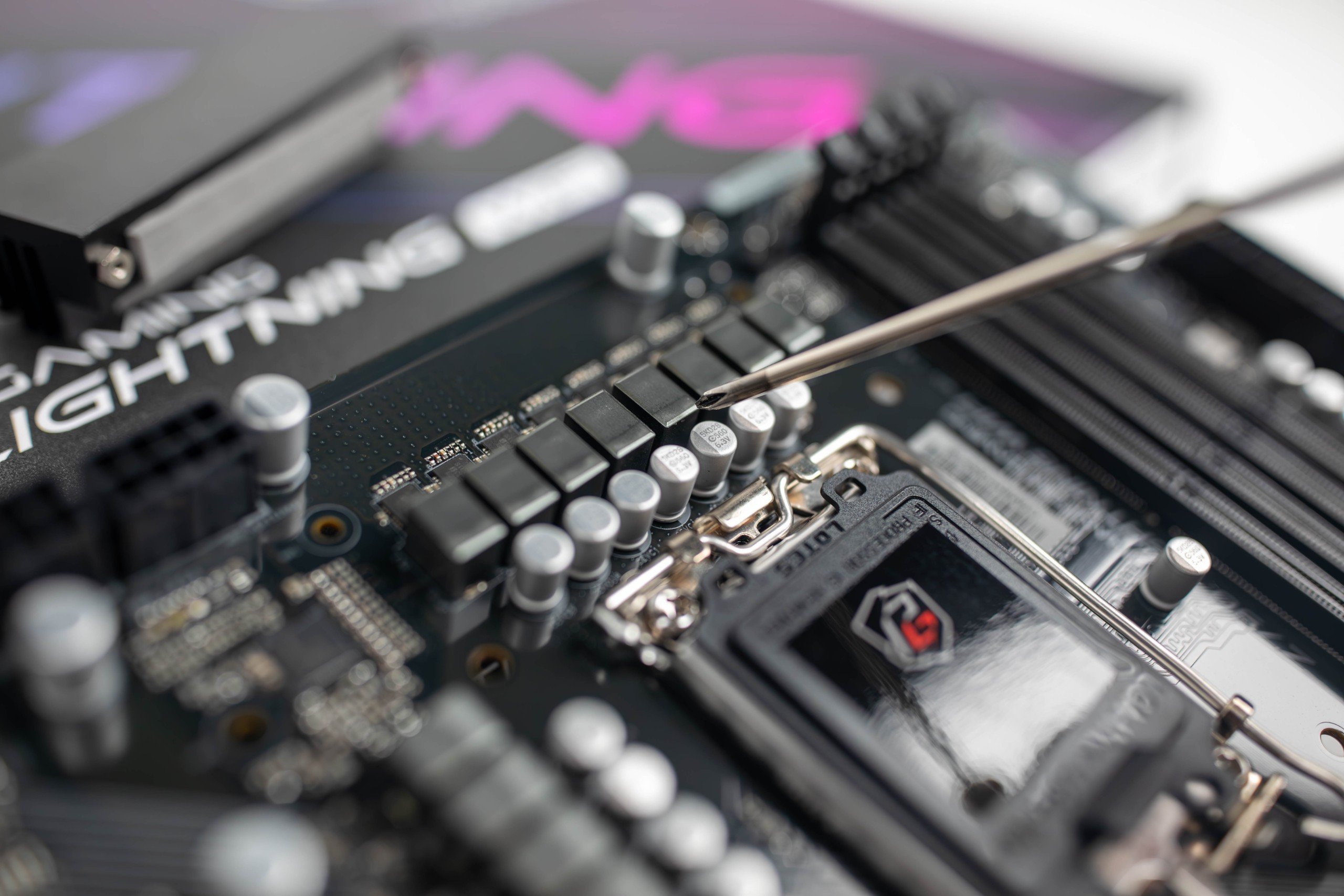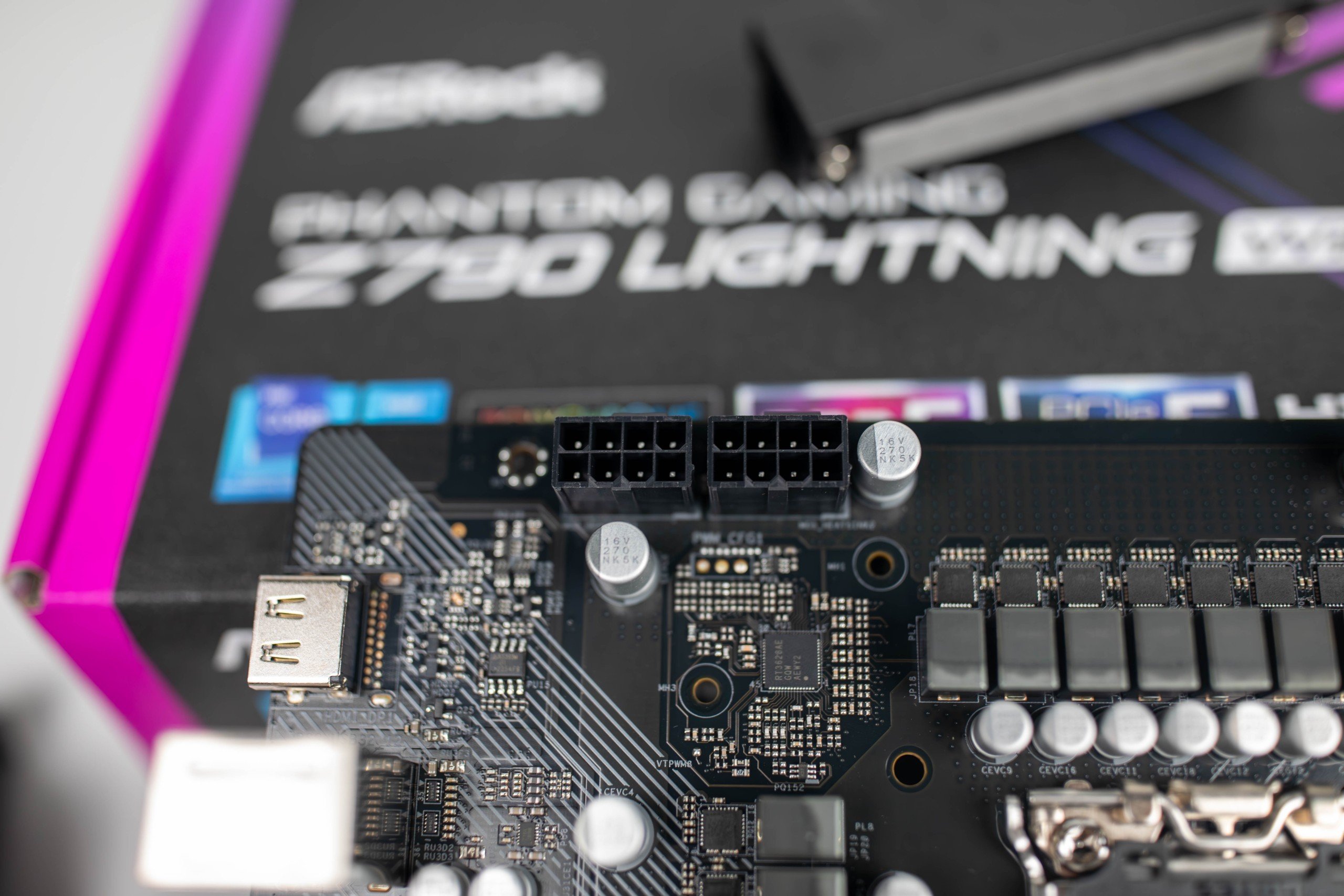 Đi sâu vào chi tiết mạch VRM của Z790 PG Lightning WiFi, bo mạch chủ được thiết kế các thành phần theo cấu hình 16 + 1 + 1 phase, bao gồm 16 phase cho CPU VCORE, 1 phase cho VCCGT và 1 phase cho VCCAUX. VCCAUX là thành phần có chức năng tương tự như VCCIO/VCCSA mà Intel gán cho các vi xử lý thế hệ trước, nhưng ở Z690/Z790 hãng thay tên đổi họ. Bản thân VCCAUX chịu trách nhiệm cấp nguồn/điều khiển cho bộ điều khiển bộ nhớ của CPU và Bộ điều khiển PCIe.