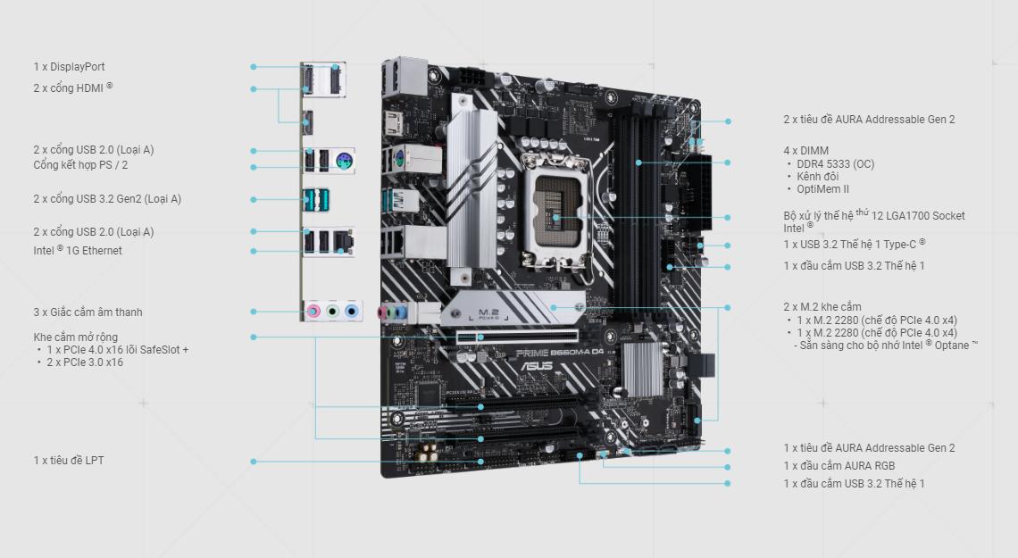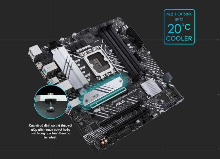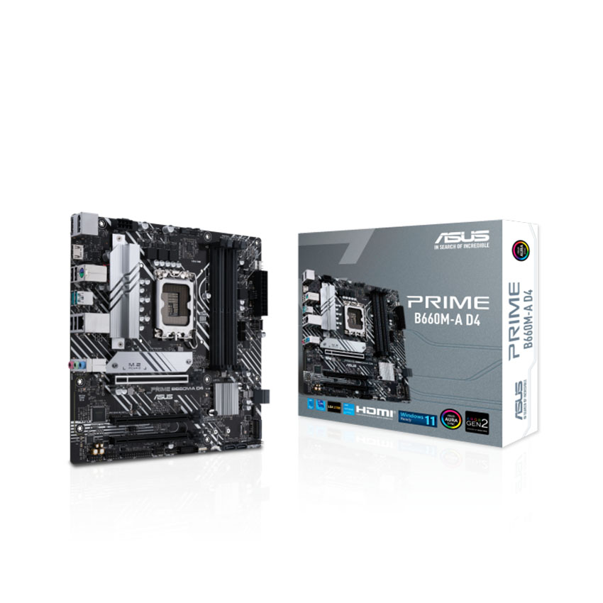 Dòng bo mạch chủ ASUS Prime được thiết kế chuyên nghiệp để phát huy hết tiềm năng của bộ vi xử lý Intel ® Thế hệ thứ 12 . Tự hào với thiết kế năng lượng mạnh mẽ, giải pháp làm mát toàn diện và các tùy chọn điều chỉnh thông minh, Prime B660 cung cấp cho người dùng và các nhà xây dựng PC DIY một loạt các tùy chọn điều chỉnh hiệu suất thông qua các tính năng phần mềm và phần mềm trực quan. ASUS PRIME B660M-A D4 mang đến một thiết kế đẹp mắt, mang phong cách tương lai với lớp hoàn thiện màu đen và trắng, các yếu tố thiết kế lấy cảm hứng từ tàu con thoi, bảng tên bằng kim loại và vỏ PCB.