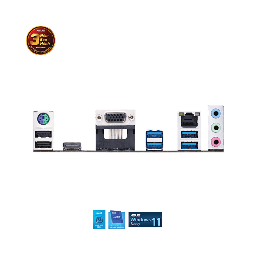| Cổng kết nối (Back Panel) | 4 x USB 3.2 Gen 1 ports (4 x Type-A) 2 x USB 2.0 ports (2 x Type-A) 1 x D-Sub port 1 x HDMI® port 1 x Realtek 1Gb Ethernet port 3 x Audio jacks 1 x PS/2 Keyboard/Mouse combo port |