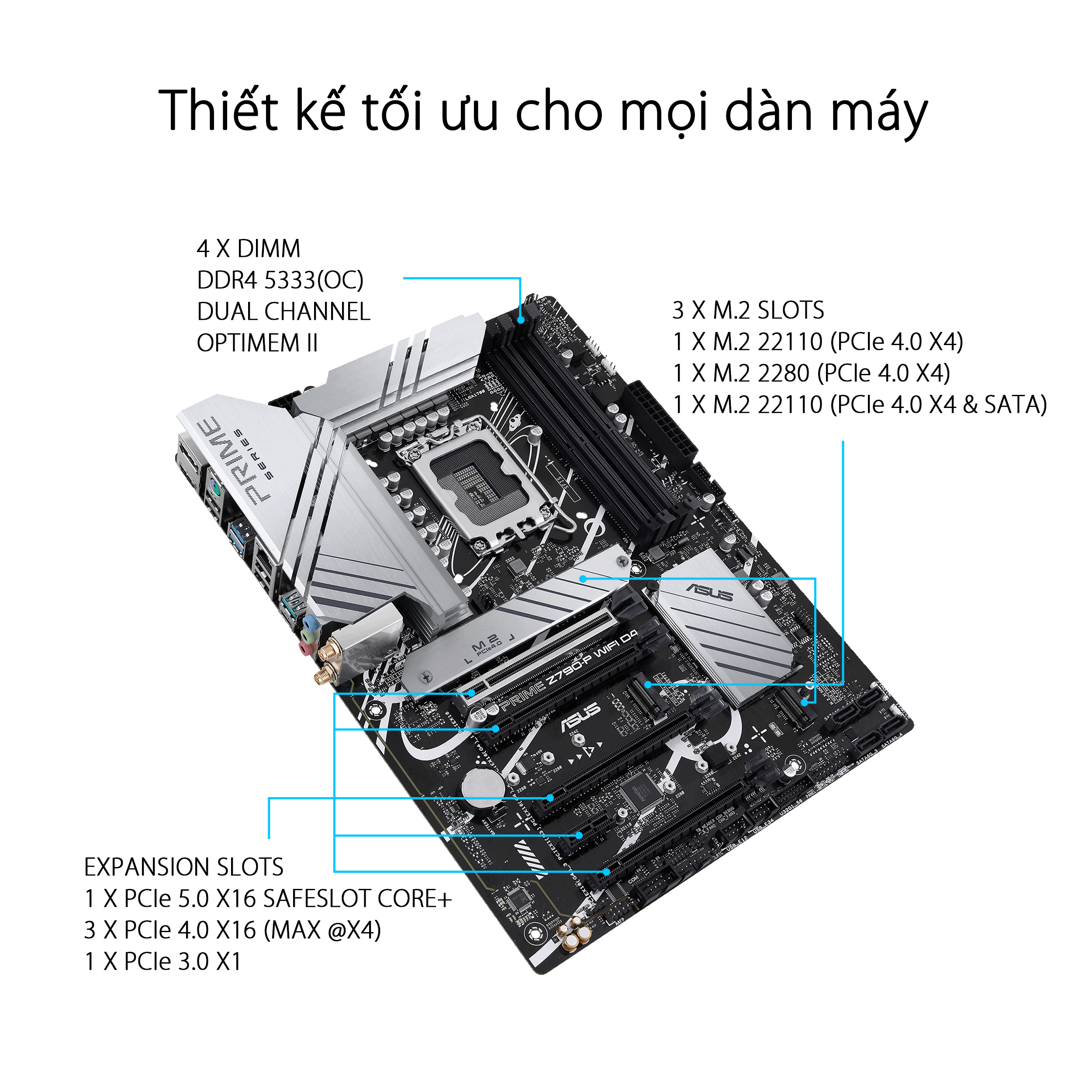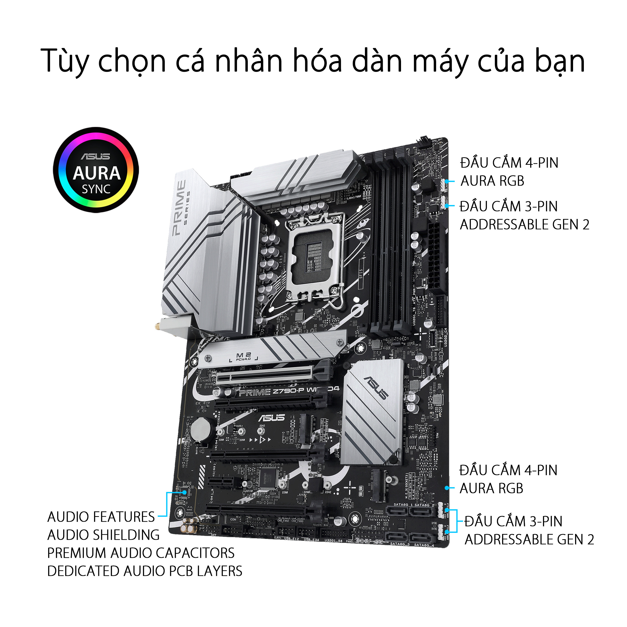 Bo mạch chủ PRIME Z790-P WIFI D4-CSM được thiết kế với nhiều bộ tản nhiệt tích hợp và một loạt các đầu cắm quạt kết hợp để đảm bảo giàn máy của bạn luôn mát mẻ và ổn định dưới khối lượng công việc cường độ cao.