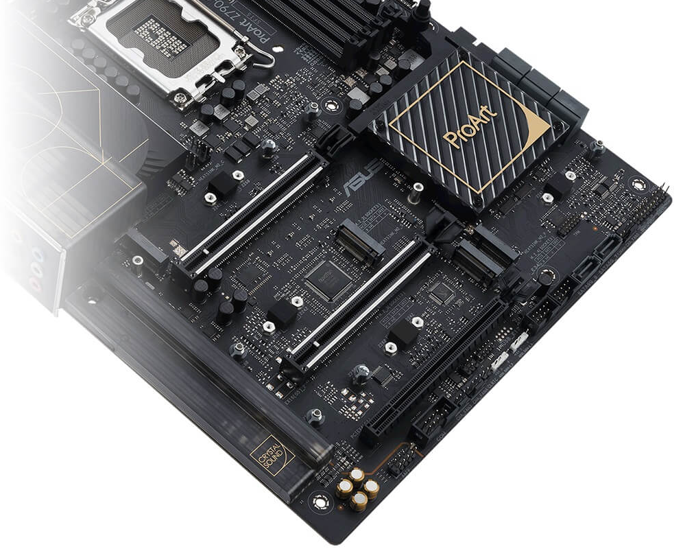 Trang bị 4 khe PCIe 4.0, ASUS ProArt Z790 CREATOR WIFI DDR5 đã mang đến sự thoải mái trong việc lắp đặt bộ nhớ lưu trữ. Kết hợp với RAID SSD NVMe, những chiếc ổ cứng SSD sẽ được đẩy lên tốc độ truyền, xử lý dữ liệu nhanh nhất có thể tới người dùng.