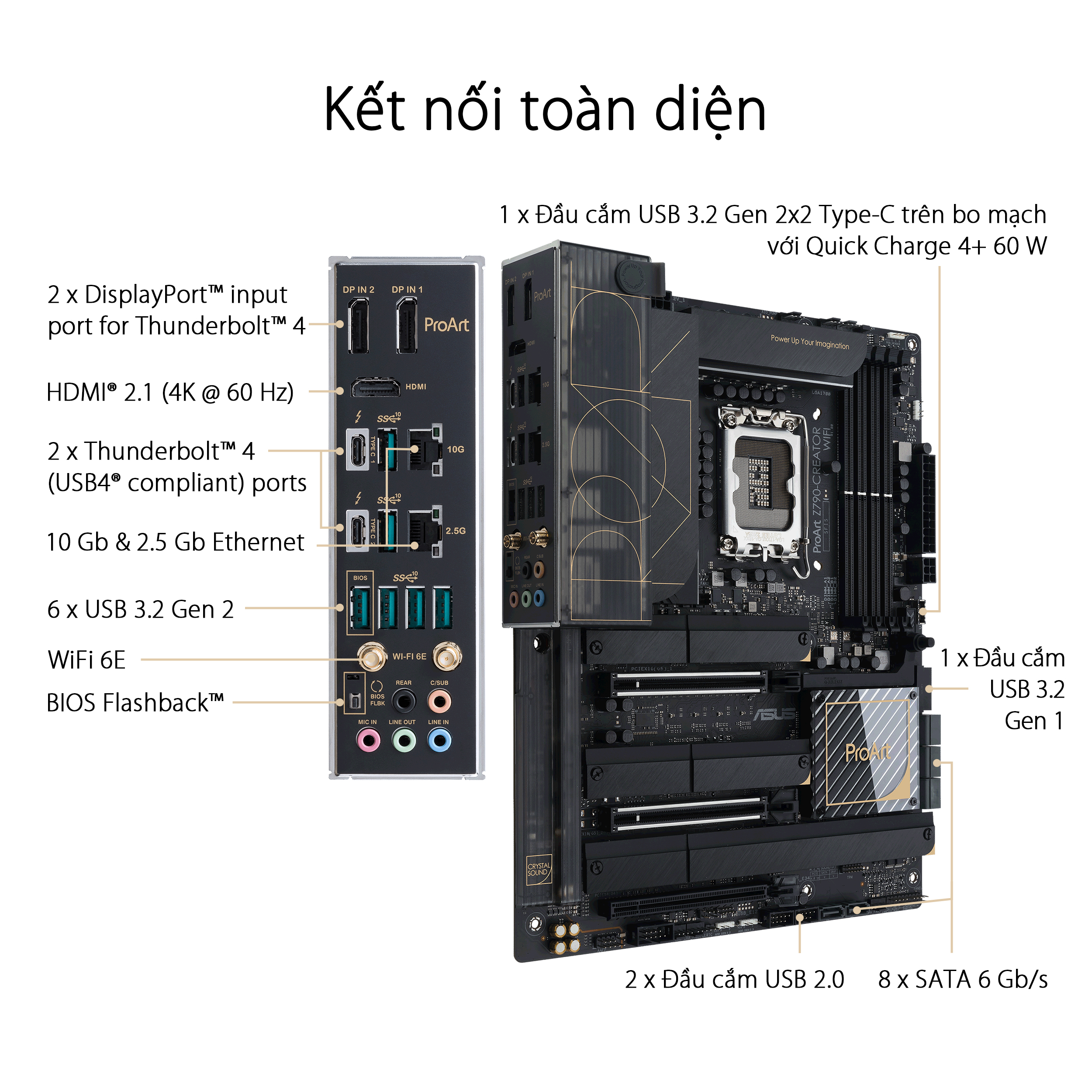 Mainboard ASUS ProArt Z790 CREATOR WIFI DDR5 sẽ hỗ trợ cho bạn với tối đa khả năng kết nối Internet đồng thời với 2 kiểu kết nối là WiFi và Ethernet. Với kết nối không dây, ASUS ProArt Z790 CREATOR WIFI DDR5 trang bị chuẩn WiFi 6E để mang đến những băng tần chất lượng cao nhất, tối đa lên đến 6GHz tạo nên tốc độ kết nối tuyệt vời cho nhu cầu lướt web, online. Và không thể thiếu kết nối với cổng Ethernet, thông qua đó tốc độ truyền tải dữ liệu Internet có thể đạt mức 2.5Gb cho việc streaming và 10Gb cho tốc độ upload trong mạng cục bộ (NAS).