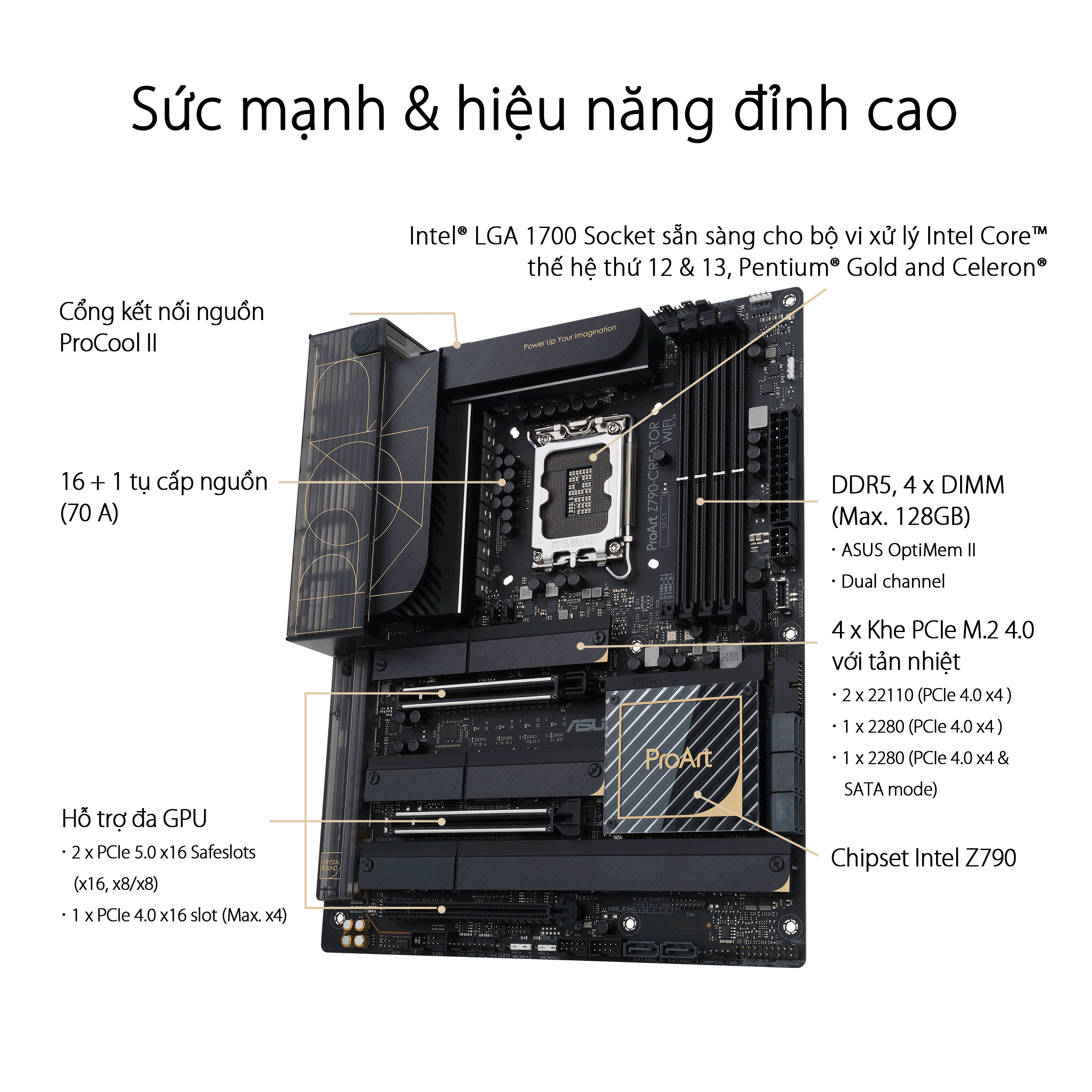 Bo mạch chủ ProArt trao quyền cho những người dùng tạo nội dung với hiệu năng không giới hạn từ CPU mới nhất, thiết kế truyền tải điện năng mạnh mẽ, khả năng tản nhiệt hiệu quả với khả năng kết nối nhanh như chớp. Công việc sáng tạo luôn đòi hỏi những bộ PC trang bị những công nghệ mới cùng khả năng hoạt động tốt nhất với mục đích phục vụ tối đa cho người dùng. Tự tin là một những thương hiệu cung cấp linh kiện hiệu quả nhất cho công việc sáng tạo, ASUS mang đến dòng mainboard CREATOR đỉnh cao. Và với model ASUS ProArt Z790 CREATOR WIFI DDR5, một lựa chọn tuyệt vời tạo nên những dàn PC dành cho dân sáng tạo.
