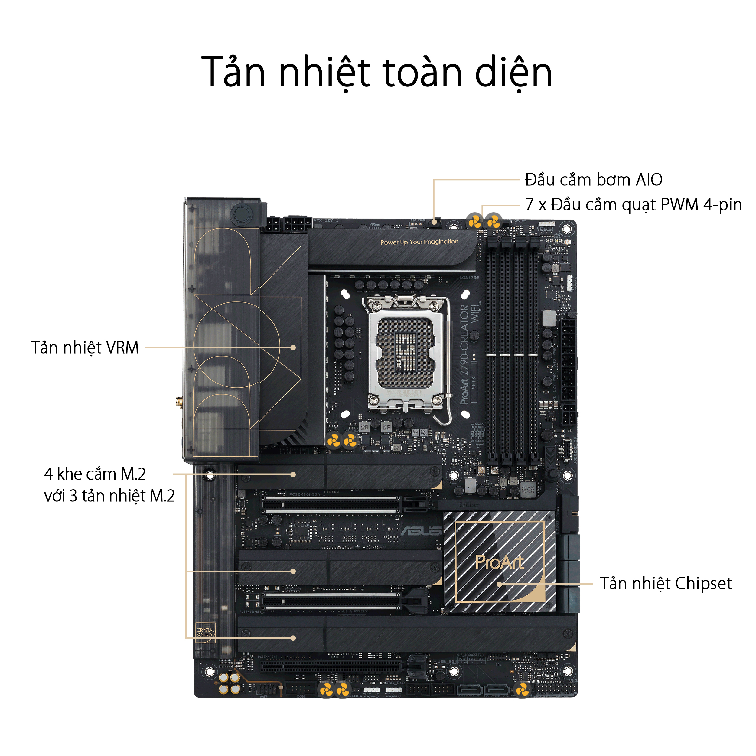 Mọi nguồn năng lượng từ PSU đều được ASUS ProArt Z790 CREATOR WIFI DDR5 xử lý trọn vẹn thông qua dàn phase nguồn đỉnh cao. Định mức cho mình ở con số 70A và 16 + 1 phase nguồn, nguồn năng lượng sẽ được xử lý để mang đến sự hiệu quả nhất cho CPU tương thích như Intel Gen 12 và Intel Gen 13. Sự ổn định ấy còn được đảm bảo thông mua module điều chỉnh điện áp (VRM) ASUS Digi+ và tính trở kháng thấp của các cổng nguồn ProCool II. Các cuộn cảm và tụ điện trên ASUS ProArt Z790 CREATOR WIFI DDR5 mang đến sự an tâm nhất định trong quá trình sử dụng nhờ vào quá trình sản xuất chất lượng cao, đạt tiêu chuẩn của ngành hàng.