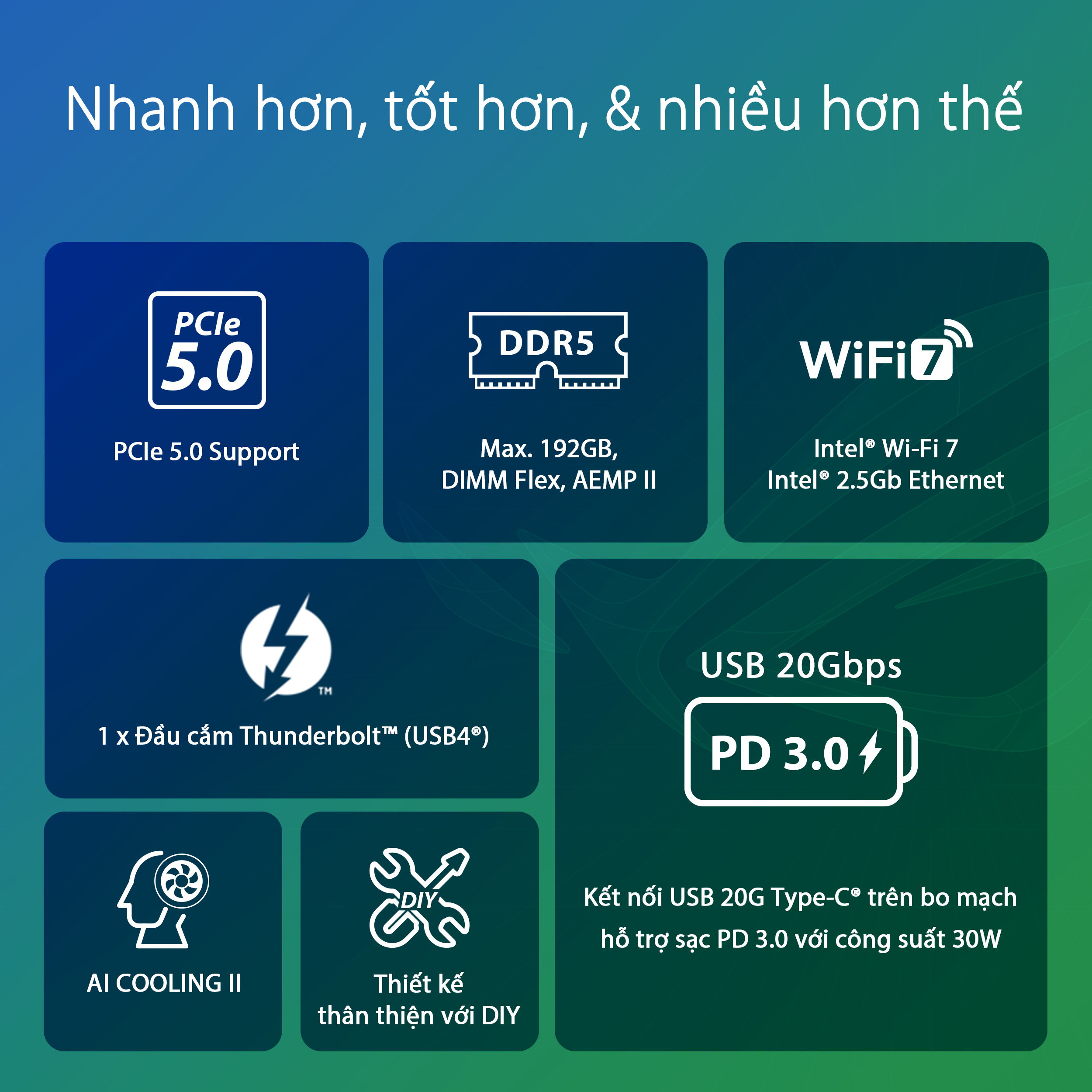 Extreme Engine Digi+ - Tụ điện kim loại đen 5K ASUS Q-Design - M.2 Q-Latch - PCIe Slot Q-Release - Q-Antenna - Q-DIMM - Q-LED (CPU [màu đỏ], DRAM [màu vàng], VGA [màu trắng], Boot Device [màu xanh lá]) - Q-Slot Giải pháp Nhiệt ASUS - Tấm ốp tản nhiệt M.2 - Bộ làm mát M.2 - Thiết kế tản nhiệt VRM ASUS EZ DIY - Nút BIOS FlashBack™ - BIOS FlashBack™ LED - Nút Xóa CMOS - Bộ bảo vệ CPU Socket - ProCool II - Tấm chắn I/O lắp đặt sẵn - SafeSlot - SafeDIMM Aura Sync - Đầu cắm Aura RGB - Cổng RGB Addressable Gen 2 Front Panel USB 20Gbps with PD Fast Charge Support - Support: up to 30W fast charging and USB Wattage Watcher - Output: 5V/9V max. 3A, 12V max 2.5A - Compatible with PD3.0 |