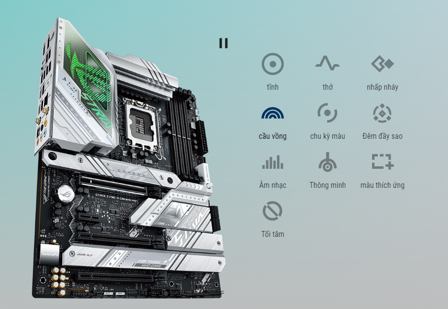 ROG Strix Z790-A mạnh dạn nắm lấy ánh sáng, để thay thế các chủ đề xây dựng cho người anh em u ám và u ám của nó, Strix Z790-F. Các tản nhiệt bằng kim loại màu bạc nổi bật trên nền PCB tối màu và thu hút sự chú ý đến khả năng quản lý nhiệt cao của bo mạch. Một lớp trong suốt trên tấm chắn I/O tạo thêm điểm nhấn độc đáo và làm nổi bật logo RGB có thể tùy chỉnh bên dưới. Toàn bộ thiết kế được gắn liền với các chi tiết lấy ROG làm trung tâm trên bo mạch, tản nhiệt và tấm chắn I/O để mang đến một triển vọng sống động và tương lai. Ghép nối Strix Z790-A với các sản phẩm khác từ hệ sinh thái ROG đa dạng để tạo ra một thiết lập chơi game được tùy chỉnh hoàn toàn, phản ánh phong cách cá nhân của bạn.