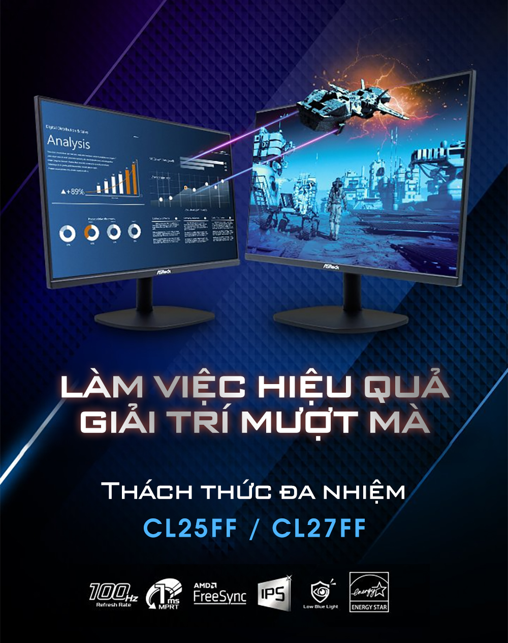 Với màn hình phẳng IPS 27 inch, ASRock CL27FF có độ phân giải Full HD và tần số quét 100Hz. Màn hình này có thời gian phản hồi 1ms (MPRT) và hỗ trợ công nghệ AMD FreeSync, giúp giảm hiện tượng xé hình. Với độ sáng 300 nits và độ tương phản 1000:1, màn hình này phù hợp cho cả công việc văn phòng và giải trí. Tuy nhiên, độ sáng không quá cao và thiết kế chân đế đơn giản có thể là điểm trừ đối với một số người dùng. Hoặc chúng ta có thể khắc phục bằng cách sử dụng giá treo màn hình thông minh, tùy chỉnh linh hoạt hơn. Tổng thể, đây là một lựa chọn tốt trong phân khúc giá rẻ cho những ai cần một màn hình đa năng.