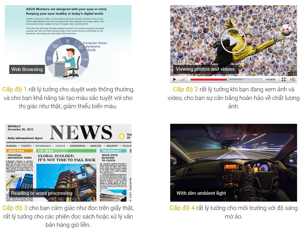 | Tính năng Video | Công nghệ miễn phí theo dõi: Có Công nghệ SPLENDID: Có GameVisual : Yes Nhiệt độ màu. Lựa chọn: Có (3 chế độ) GamePlus: Có QuickFit: Có HDCP: Có Công nghệ VRR: FreeSync™ Ánh sáng xanh dương thấp: Có |