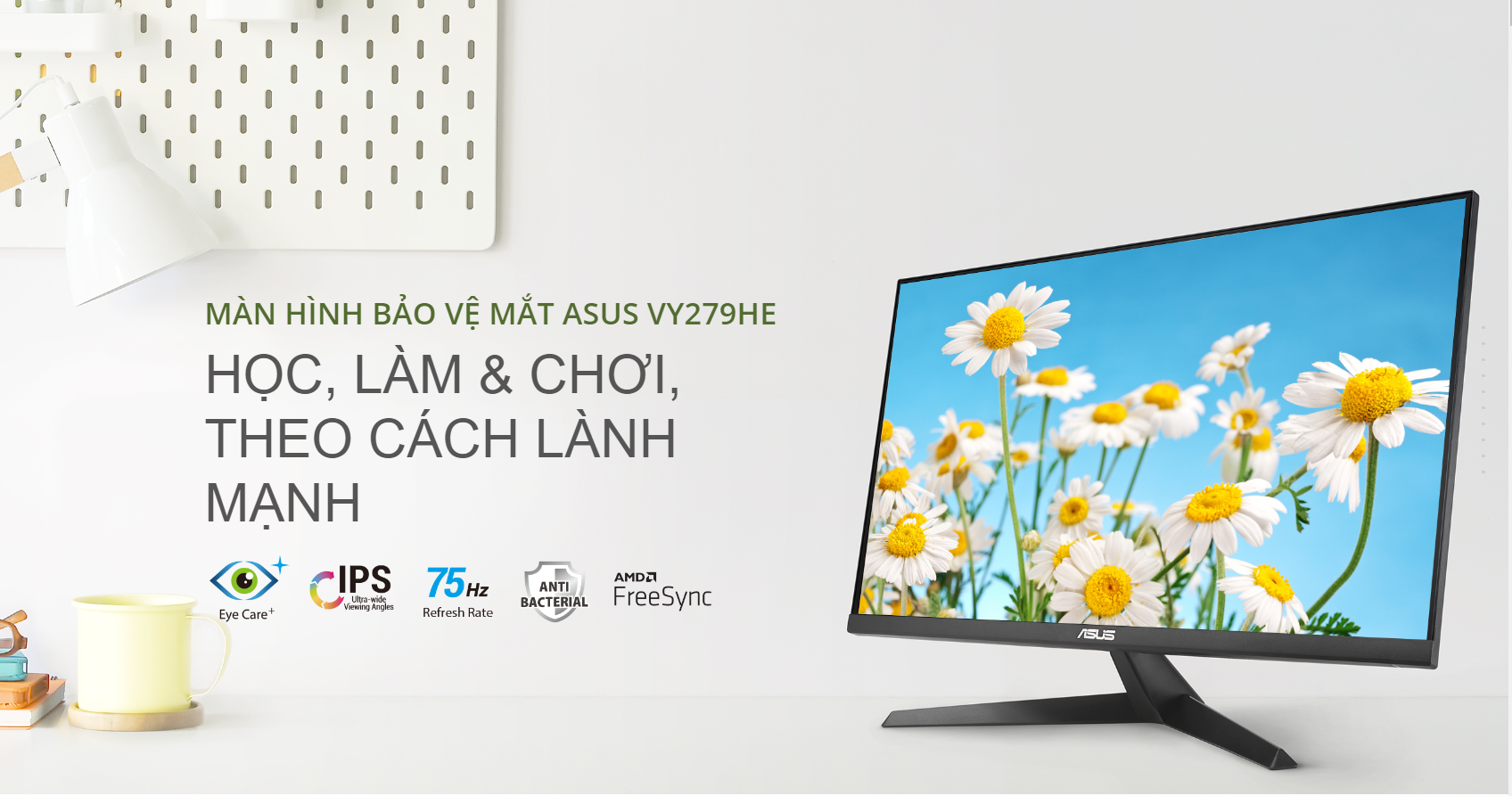 Màn hình ASUS VY279HE Eye Care được thiết kế hướng đến sức khỏe của bạn. Tích hợp công nghệ ASUS Eye Care Plus mới, phương pháp xử lý kháng khuẩn lâu dài độc quyền trên các viền và phím ấn cũng như tấm nền IPS FHD tiên tiến mang lại hình ảnh vượt trội. Lý tưởng cho việc học trực tuyến, làm việc hoặc giải trí, sự kết hợp giữa tốc độ làm mới 75Hz và hỗ trợ AMD FreeSync™ đảm bảo bạn sẽ tận hưởng hình ảnh mượt nhất với bất kỳ nội dung nào