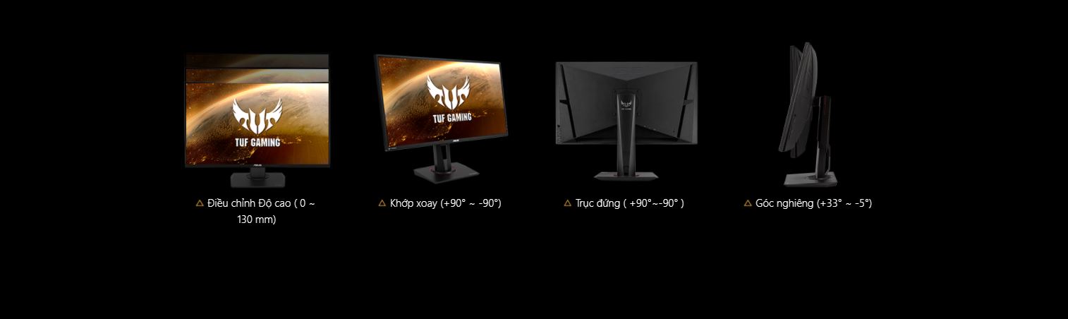 Với chân đế được thiết kế công thái học, TUF Gaming VG27AQ hỗ trợ điều chỉnh nghiêng, xoay, quay và chiều cao vì vậy bạn có thể dễ dàng chọn được vị trí xem lý tưởng. Màn hình cũng tương thích chuẩn VESA để lắp tường.