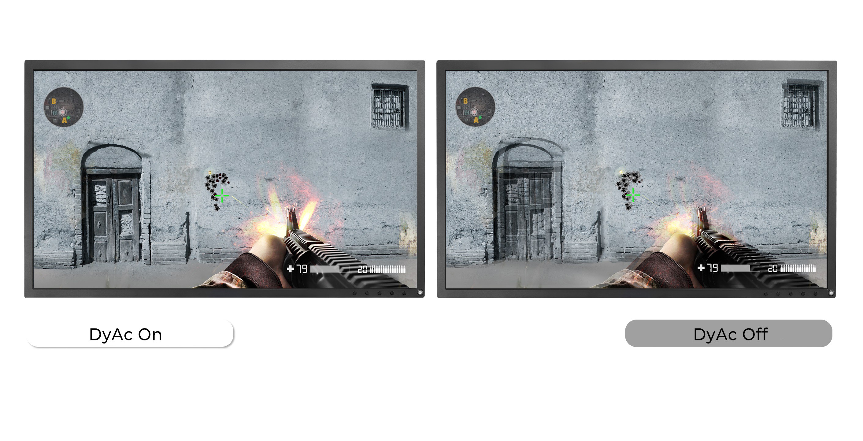 DyAc™ giúp làm giảm hiện tượng bóng mờ trong game, nhất là trong những cảnh tốc độ / giật nhanh như sấy đạn. Điều này cho phép game thủ có tầm nhìn hướng đạn / mục tiêu rõ ràng hơn, kiểm soát độ giật, gìm tâm tốt hơn (recoil control). DyAc+ dựa trên nguyên lý của công nghệ này, kết hợp với sự xử lý tối ưu hóa trên tấm nền, giúp người chơi có nhiều lựa chọn trong việc điều khiển đường đạn, hướng tâm mục tiêu, đem lại cho gamer lối chơi đa dạng hơn!