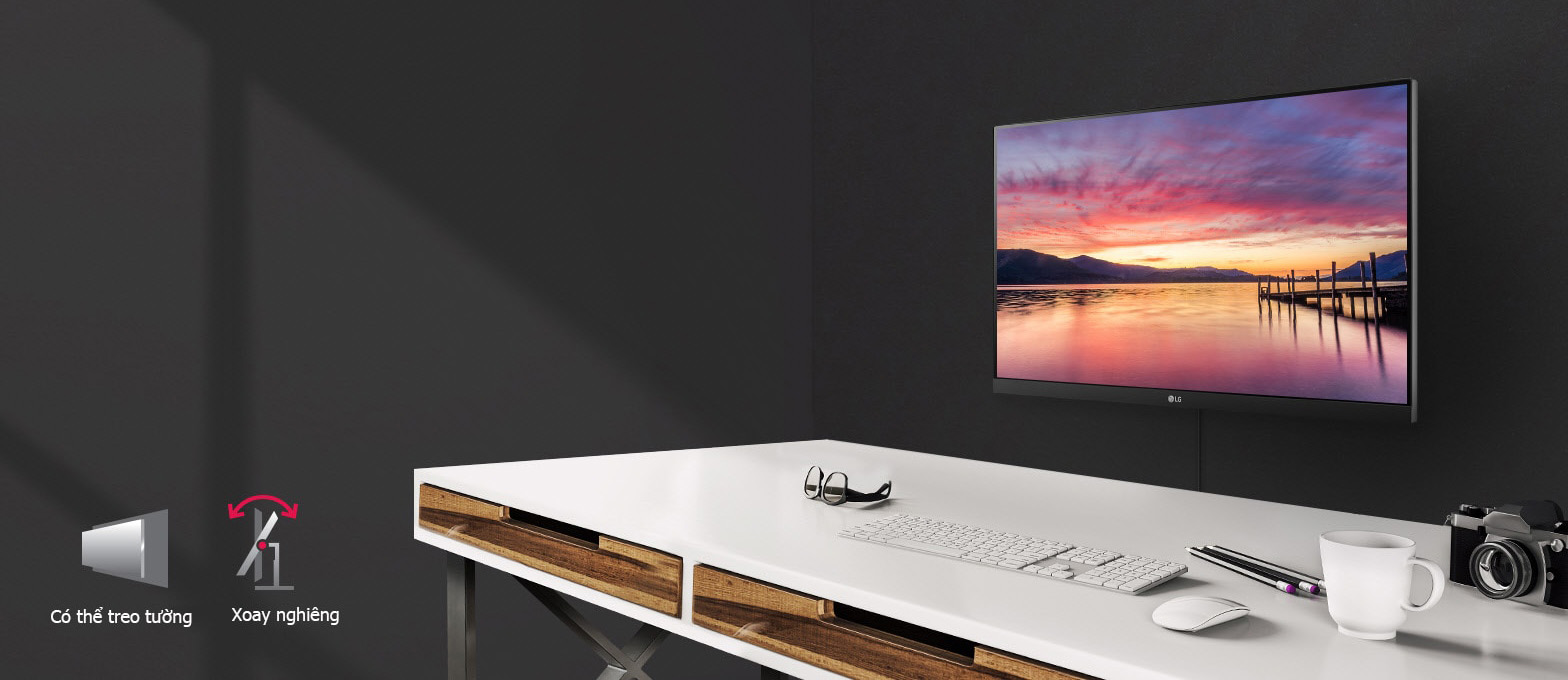 Màn hình này cho phép bạn tự do tháo màn hình khỏi bàn và treo lên tường. Cho phép bạn có được các lựa chọn xem thoải mái và tiết kiệm không gian bàn làm việc với màn hình LG có thể treo tường.