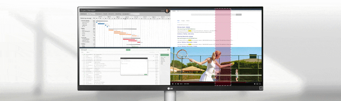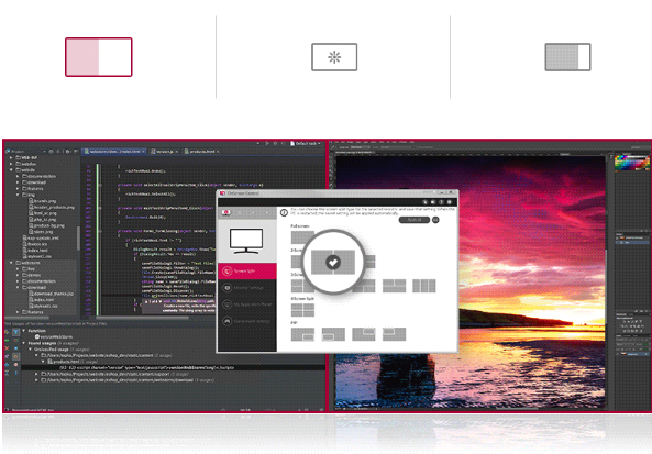 Bỏ qua các phím vật lý thông thường, màn hình LG với phần mềm OnScreen Control cho phép bạn tùy chỉnh không gian hiển thị như chia màn hình, độ sáng tối… bằng cách nháp chuột đơn giản.