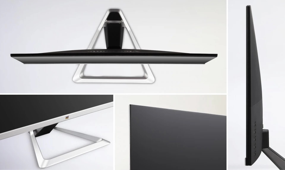 Màn hình có thiết kế đẳng cấp với sự kết hợp từ các thiết kế hiện đại như: màn hình siêu mỏng, không khung viền và thiết kế chân đế tam giác thời trang.