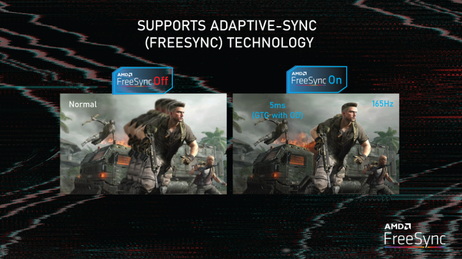 E-ROG series có tốc độ làm mới 165Hz* nhanh và thời gian phản hồi 5Ms (GTG with OD) với tính năng Adpter sync Compatible để loại bỏ bóng mờ và mang lại trải nghiệm chơi game liền mạch, không bị xé hình.
