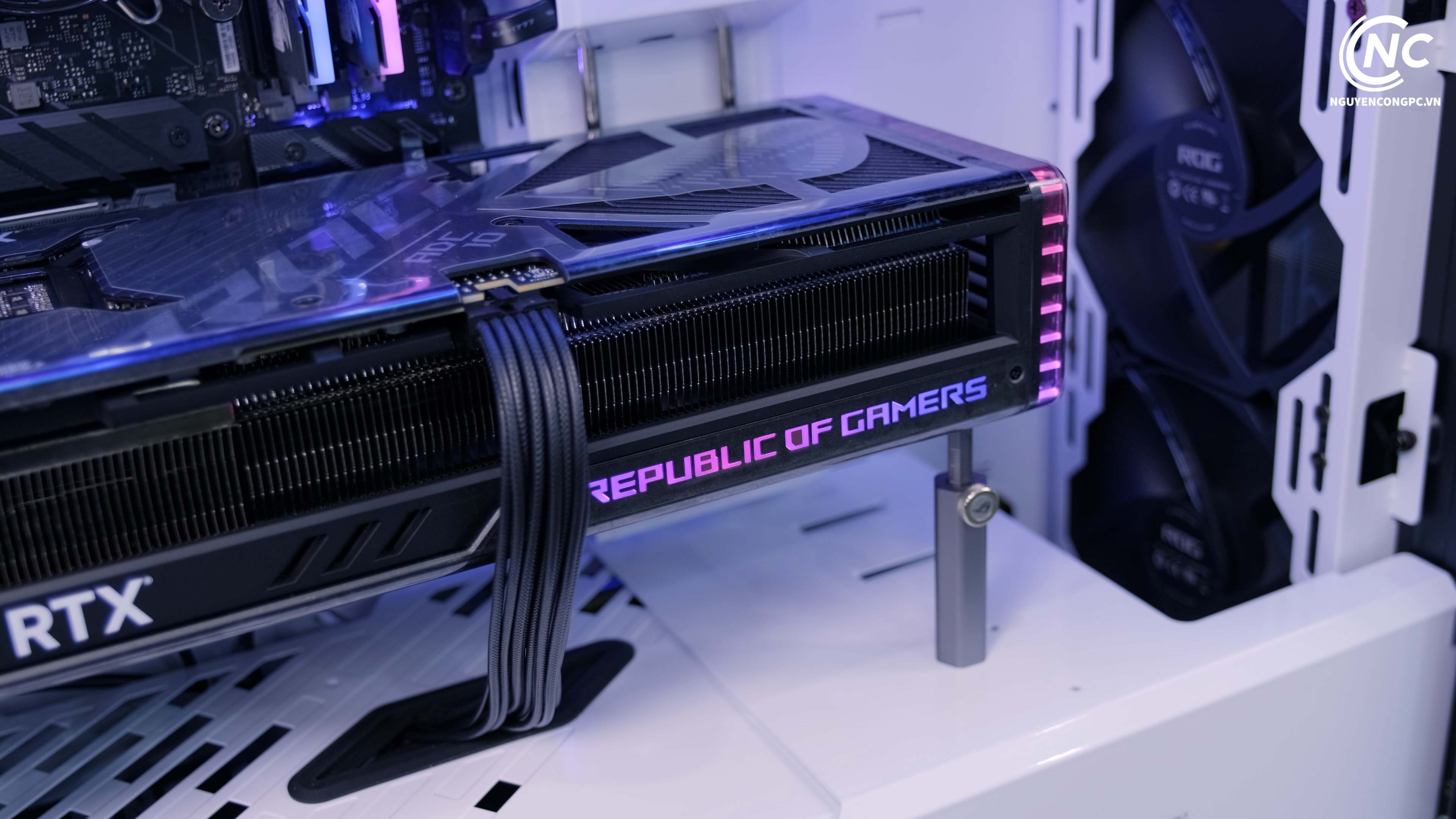 Card màn hình ASUS ROG STRIX RTX4090 O24G GAMING, ASUS đã đặt ra các yêu cầu về thiết kế làm mát với ưu tiên hàng đầu. Thiết kế 3.5 khe cắm của card đồ hoạ bao trọn với khung kim loại đúc, tấm che và tấm kim loại mặt sau. Cấu trúc siêu cứng sử dụng các khung kim loại để ngăn PCB bị xệ hoặc cong vênh, trong khi vẫn cho phép luồng không khí đối lưu thông qua một lỗ thông hơi mở rộng dọc theo phía mặt sau.