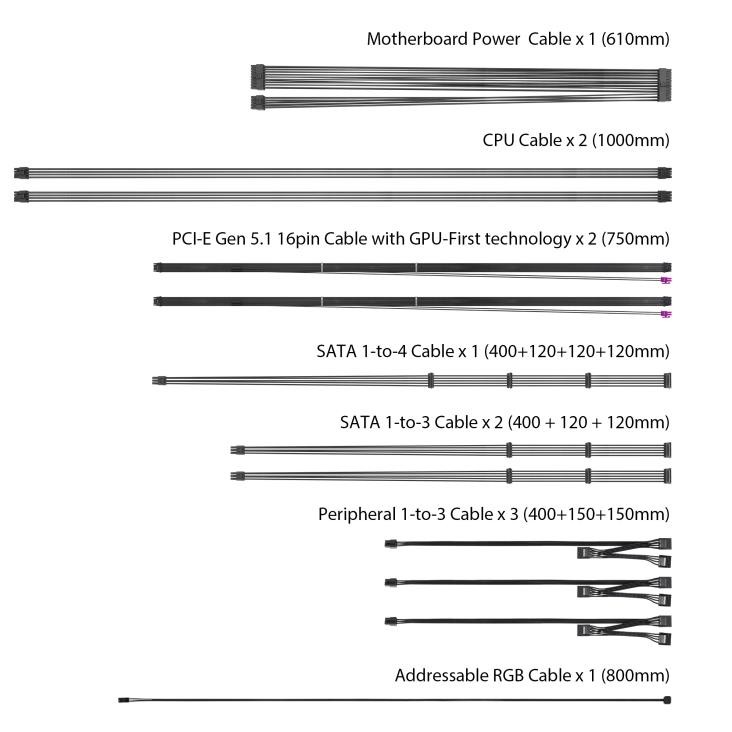 Dây nguồn x1 Dây 24 pin x1 (610mm) Cáp CPU x2 (1000mm) Cáp PCI-E Gen 5 16-pin x2 (750mm) Cáp PCI-E 1-to-1 x4 (750mm) Cáp SATA 1-to-4 x1 (400+120+120+120mm) Cáp SATA 1-to-3 x2 (400+120+120mm) Cáp Peripheral 1-to-3 x3 (400+150+150mm) Cáp ARGB x1 (800mm) Bộ ốc vít, dây buộc, sticker & hướng dẫn sử dụng |