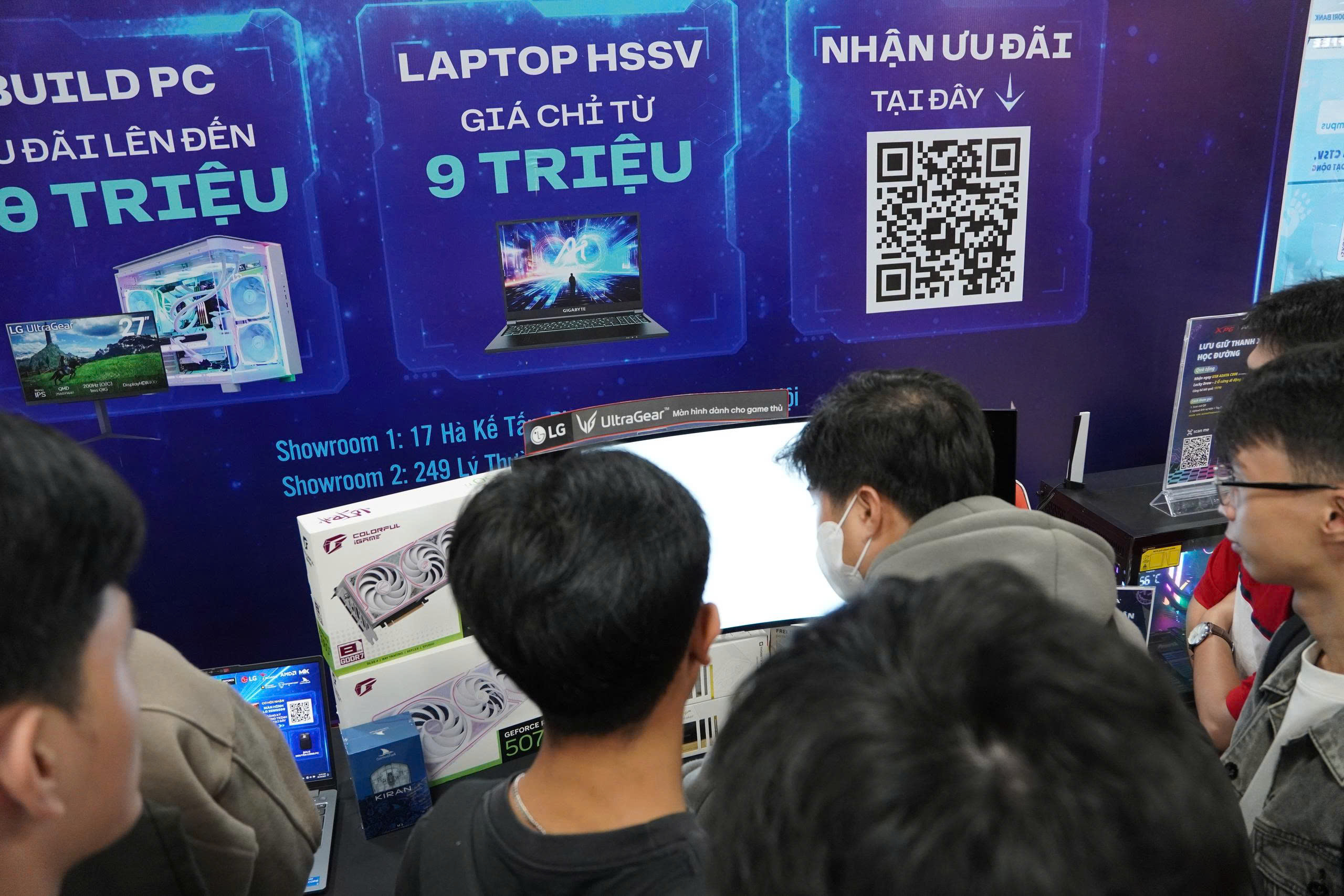 Sinh viên say mê khám phá các mẫu máy tính và thiết bị gaming hiệu suất cao.