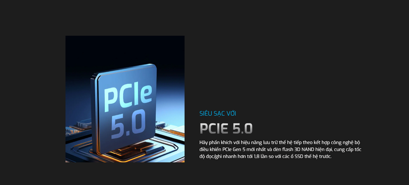 Hãy phấn khích với hiệu năng lưu trữ thế hệ tiếp theo kết hợp công nghệ bộ điều khiển PCIe Gen 5 mới nhất và đèn flash 3D NAND hiện đại, cung cấp tốc độ đọc/ghi nhanh hơn tới 1,8 lần so với các ổ SSD thế hệ trước.