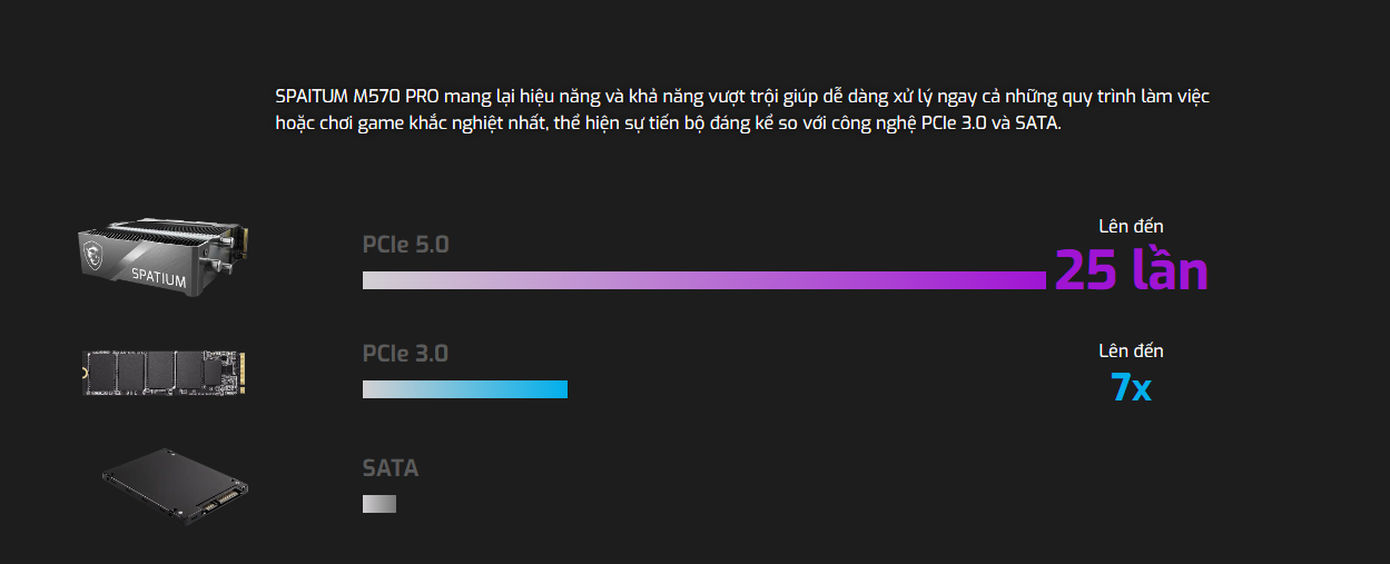 SPAITUM M570 PRO mang lại hiệu năng và khả năng vượt trội giúp dễ dàng xử lý ngay cả những quy trình làm việc hoặc chơi game khắc nghiệt nhất, thể hiện sự tiến bộ đáng kể so với công nghệ PCIe 3.0 và SATA.