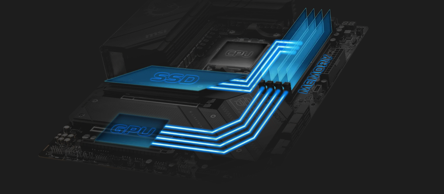DirectStorage tăng tốc thời gian tải trong trò chơi và kết xuất độ phân giải cao, nâng cao hiệu năng hệ thống bằng cách cho phép giải nén phần cứng trực tiếp từ ổ NVMe sang GPU và giải phóng tài nguyên CPU để thực hiện đa nhiệm.