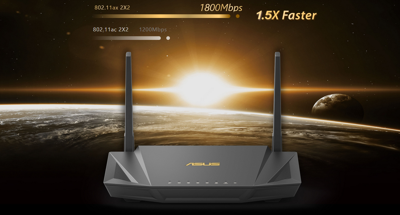 Router WiFi ASUS RT-AX56U (AX1800 Dual Band WiFi 6) có khả năng cung cấp băng thông 80 MHz và 1024-QAM để cải thiện đáng kể tốc độ của các kết nối không dây. Với tổng tốc độ mạng khoảng 1800 Mbps - 574 Mbps trên băng tần 2,4 GHz và 1201 Mbps trên băng tần 5 GHz - RT-AX56U nhanh hơn 1,5 lần so với router băng tần kép 802.11ac 2x2.
