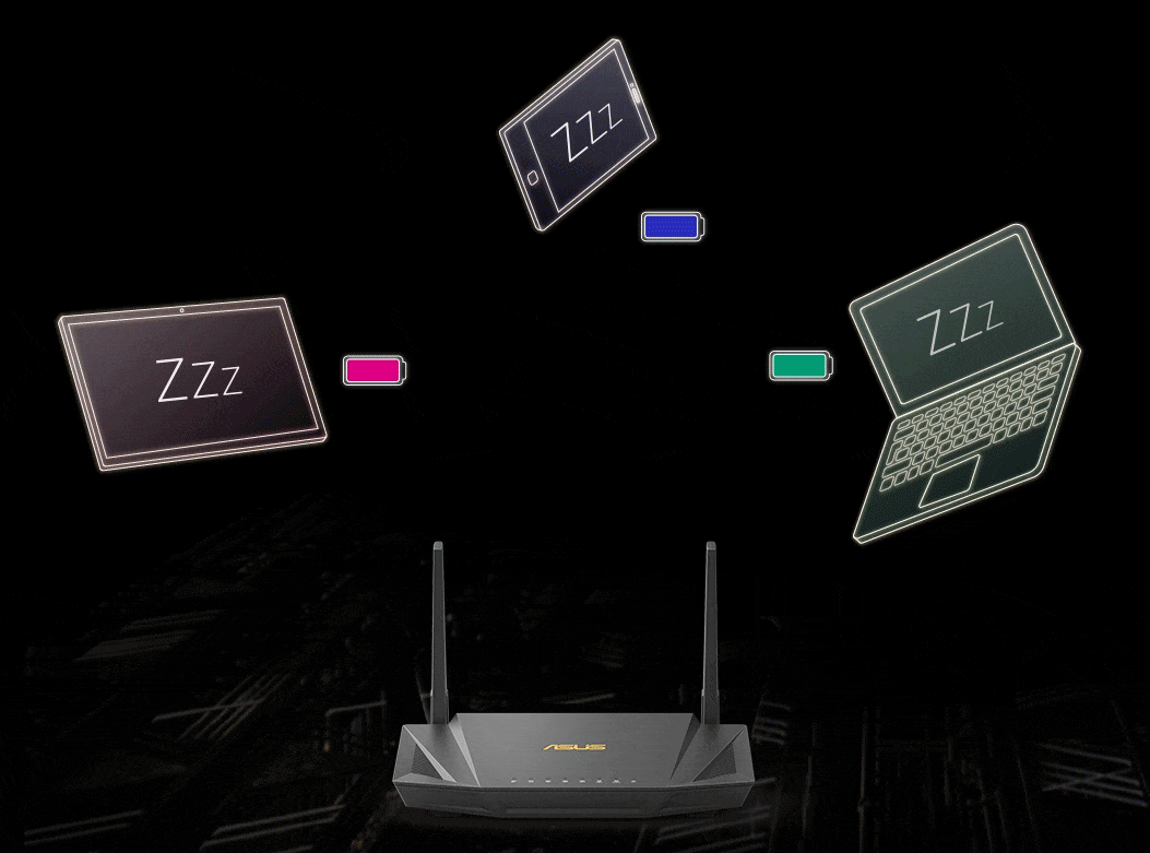 Thời gian đánh thức mục tiêu (TWT) cho phép RT-AX56U thiết lập các khoảng thời gian chỉ định cho các thiết bị phát dữ liệu. Điều này cho phép các thiết bị vào chế độ ngủ khi không cần tín hiệu bộ định tuyến, giảm được tiêu thụ điện năng tới 7 lần để tăng đáng kể dung lượng pin*.
