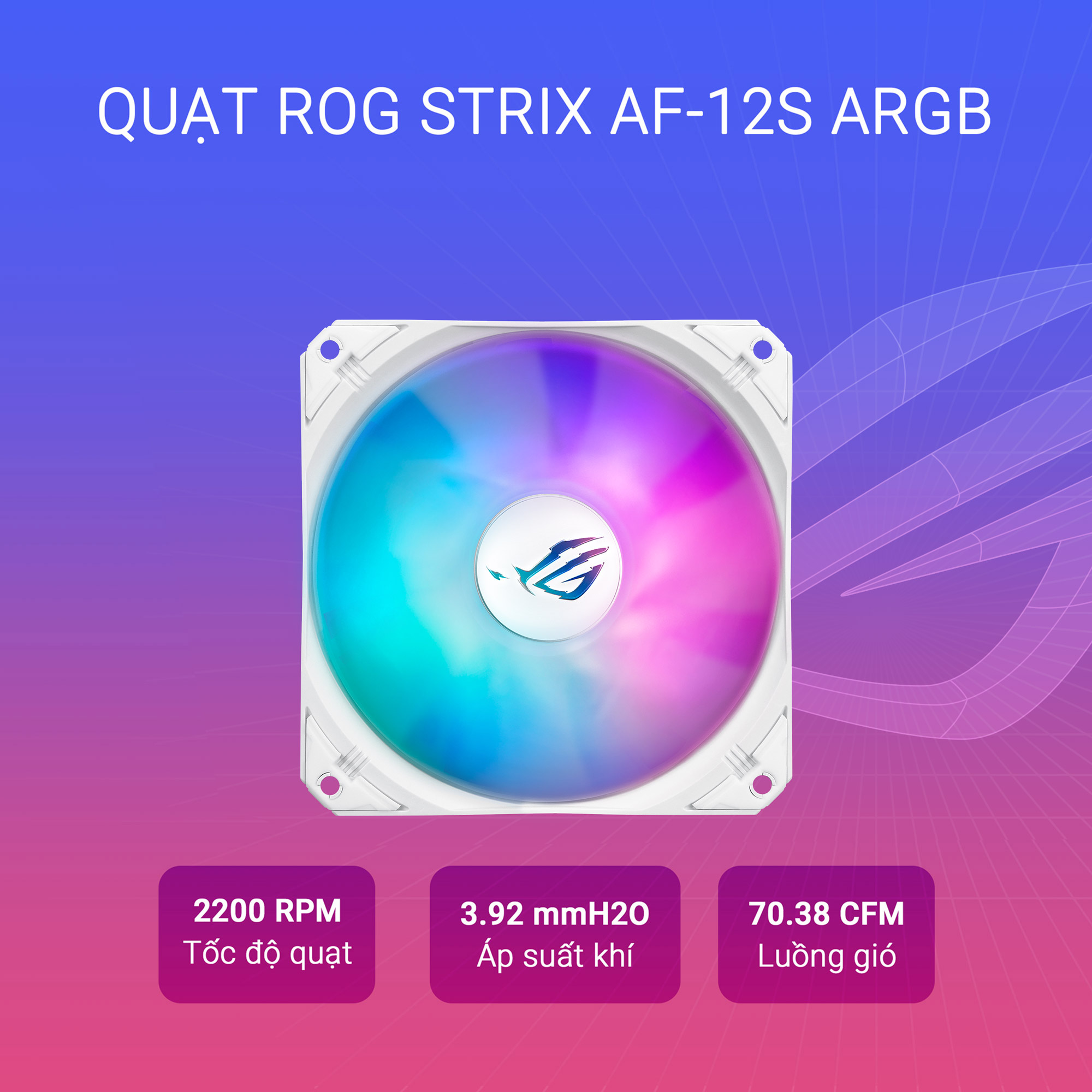 Quạt:QUẠT ROG STRIX AF-12S ARGB - Kích thước:3 x Chỗ Gắn Quạt (120mm) - Kích thước:120 x 120 x 25 mm - Tốc độ:800 - 2200 RPM ± 10% (Hỗ trợ 0 RPM) - Áp suất tĩnh:3.92 mmH2O - Luồng Không Khí:70.38 CFM - Độ ồn:36 dB(A) - Chế độ điều khiển:PWM/ DC |