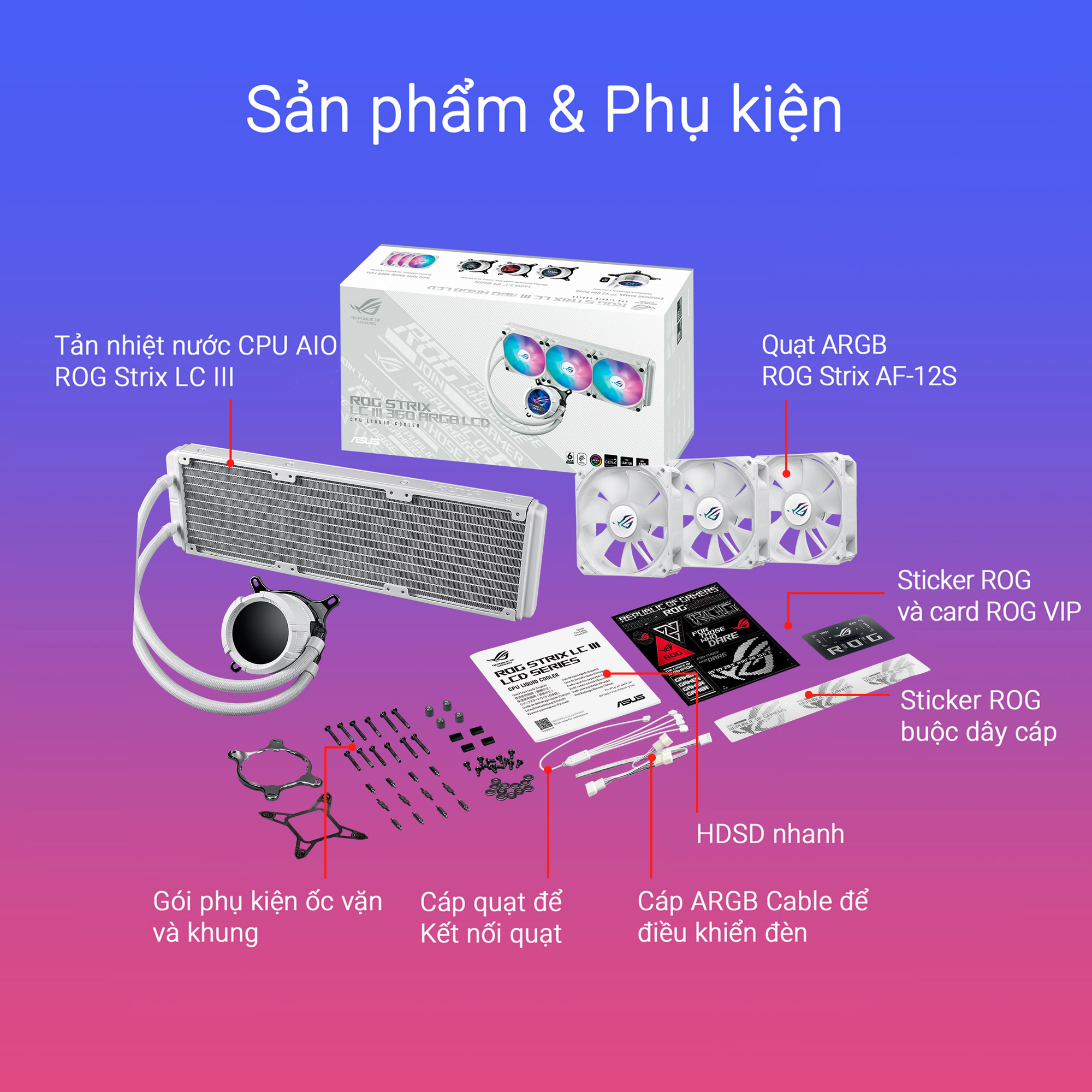 1 x Bộ tản nhiệt CPU bằng nước (dung dịch tản nhiệt nước có sẵn) 3 x Quạt Tản Nhiệt 120 mm 1 x Cáp chia quạt 1 ra 3 1 x Cáp chia ARGB 1 ra 4 1 x Gói phụ kiện ốc vít và bộ khung chuyển đổi 1 x Hướng dẫn sử dụng nhanh 1 x Sticker ROG 1 x Giá đỡ cáp ROG 1 x Thẻ VIP ROG |