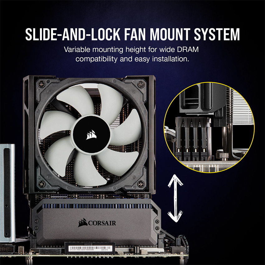 Để làm được điều này, Corsair đã đưa một “mánh lới” quảng cáo gửi đến người dùng: quạt có thể được đặt ở độ cao thay đổi (hoặc loại bỏ hoàn toàn) như trên khung lắp đặt của tản và có thể di chuyển lên trên nếu RAM có heatsink lớn. Tuy nhiên, điều này sẽ phải phụ thuộc vào không gian của vỏ case khi phải cho phép tản nhiệt có chiều cao hơn 17 cm. Hai quạt ML120 PWM đi kèm hoạt động trong dải tốc độ từ 400 đến 2.400 vòng / phút.