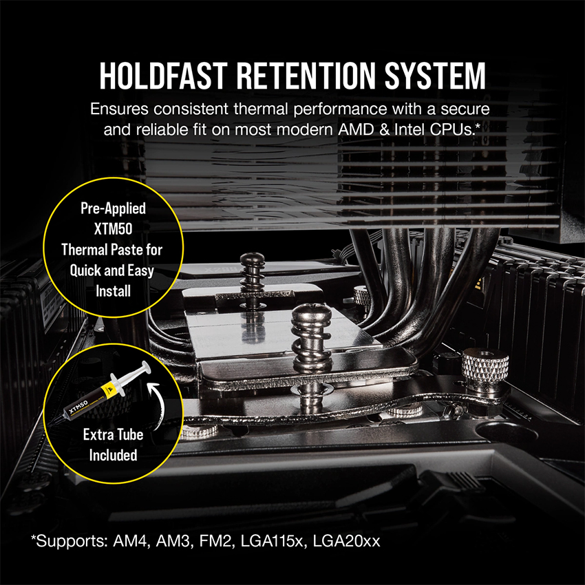 Về thiết kế hệ thống tản nhiệt, Corsair sử dụng bốn ống dẫn nhiệt tiếp xúc trực tiếp với CPU thông qua đế tiếp xúc. Hai ống dẫn nhiệt bên ngoài dày 6 mm, trong khi hai ống bên trong có đường kính 8 mm. Nhờ việc thiết kế này, Corsair hứa hẹn rằng sẽ giải nhiệt cho CPU có TDP lên tới 250W. Sản phẩm hỗ trợ đầy đủ cho tất cả các bộ xử lý trên các loại socket AMD FM1, FM2, AM3, AM4 và Intel LGA 115x, 2011 (-3) và 2066. Tuy nhiên, sản phẩm không hỗ trợ dòng AMD Threadripper TR4 hoặc TRX4 không được hỗ trợ, do các vi xử lý này có TDP lên tới 280 watt, đó là lý do Corsair khuyên dùng các bộ tản nhiệt AIO mạnh mẽ khác từ hãng.