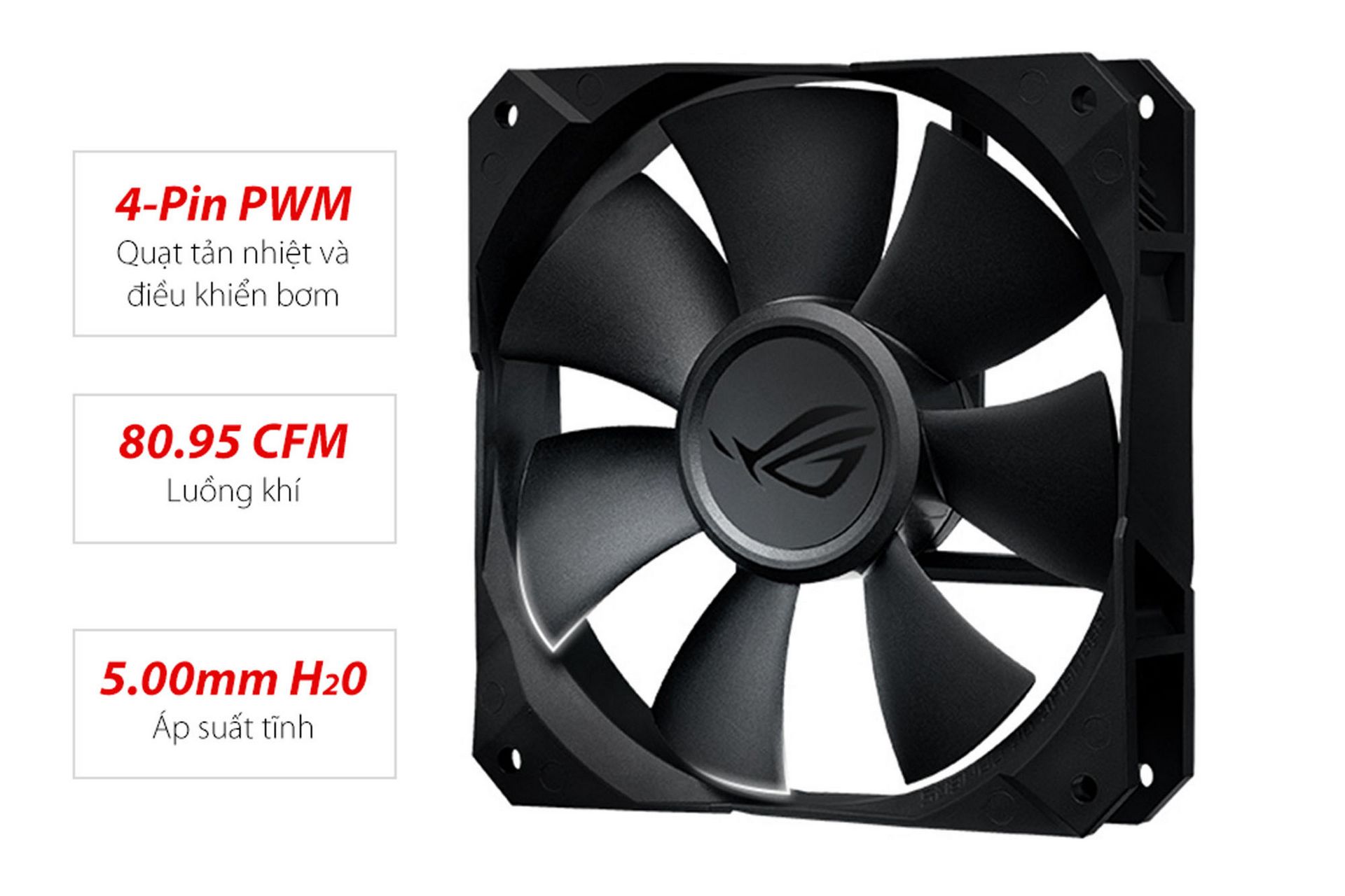 Quạt tản nhiệt ROG được điều chỉnh đặc biệt để mang lại hiệu suất tối ưu với bộ tản nhiệt ASUS ROG STRIX LC 120, tạo ra ~81CFM / 5.0mm H2O cho hiệu quả làm mát vượt trội với hiệu ứng hình ảnh RGB ấn tượng.
