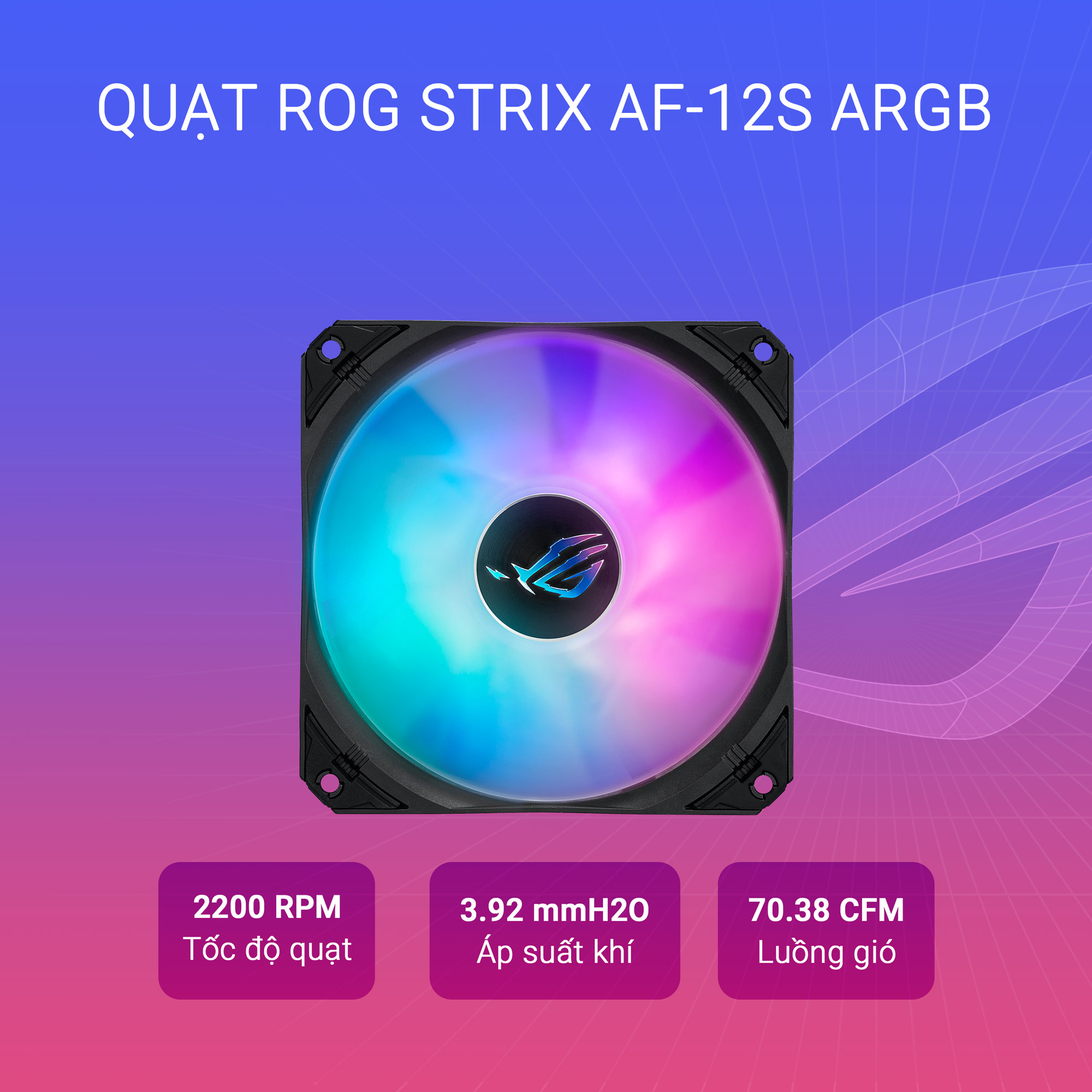 Quạt:QUẠT ROG STRIX AF-12S ARGB - Kích thước:3 x Chỗ Gắn Quạt (120mm) - Kích thước:120 x 120 x 25 mm - Tốc độ:800 - 2200 RPM ± 10% (Hỗ trợ 0 RPM) - Áp suất tĩnh:3.92 mmH2O - Luồng Không Khí:70.38 CFM - Độ ồn:36 dB(A) - Chế độ điều khiển:PWM/ DC |