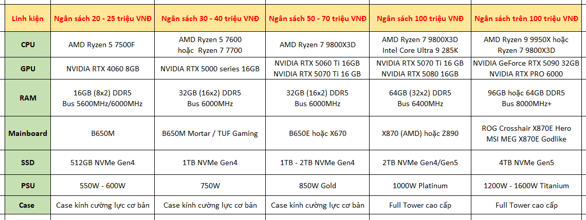 Cấu hình tiêu biểu: CPU Intel Core i5 (dòng K) hoặc i7 non-K, AMD Ryzen 7. GPU RTX 4070 Super / 4070 Ti Super. RAM 32GB DDR5.