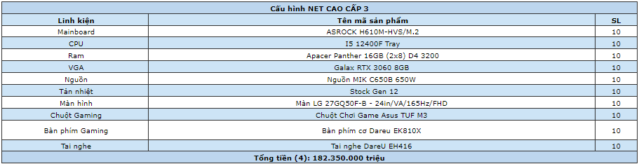 Dưới đây, Nguyễn Công PC xin giới thiệu đến quý khách hàng gói trọn bộ OPTION 1 - CẤU HÌNH NET CHUẨN 1 100 máy đạt tiêu chuẩn Game Net chuyên nghiệp. Đảm bảo cấu hình Max Setting với tất cả các tựa game chiến như LOL, PUBG, CS:GO, GTA, FO4... đáp ứng tốt nhất nhu cầu chơi game của các game thủ. Ngoài ra trong Option này, đã có hơn 30 máy tiêu chuẩn cao cấp để tổ chức các giải đấu chuyên nghiệp cho anh em. Với các cấu hình sử dụng card đồ họa RTX 3060 8GB/ RTX 3060 Ti 8GB cao cấp, màn hình 27 inch với 165Hz, cho người dùng trải nghiệm tốt nhất khi sự dụng.