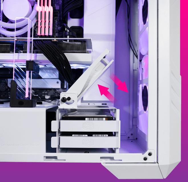 Một quạt 120mm được đặt trên đỉnh của lồng HDD, cung cấp khả năng làm mát GPU chuyên dụng để đảm bảo hiệu suất tối đa. Giá đỡ quạt có thể xoay để phù hợp với nhiều kích thước và cấu hình GPU khác nhau.