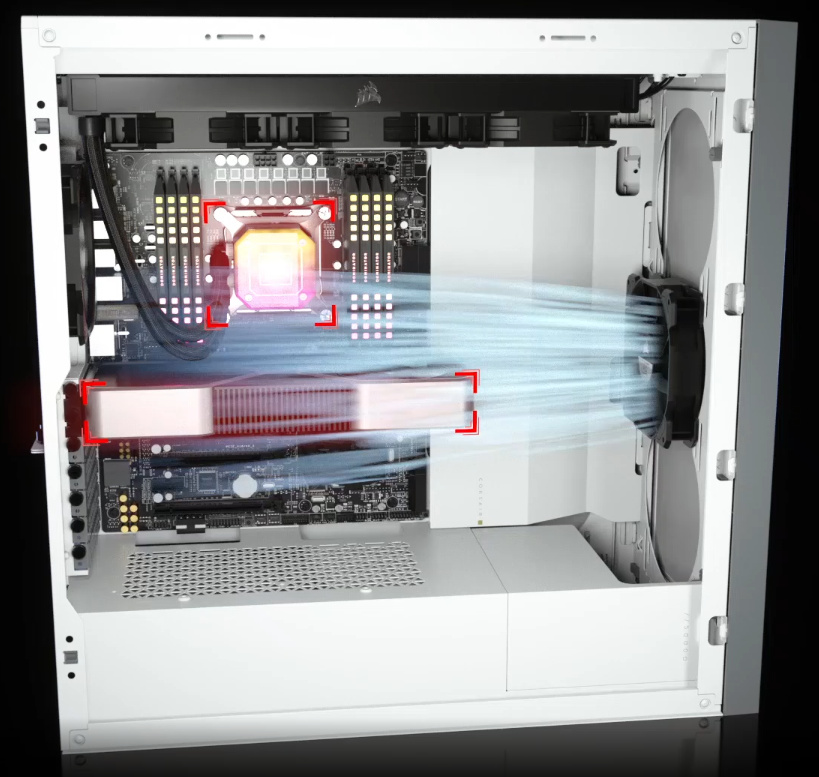 | Được trang bị hai quạt CORSAIR AirGuide 120mm có cánh gạt chống xoáy để tập trung luồng không khí và tăng cường khả năng làm mát. |