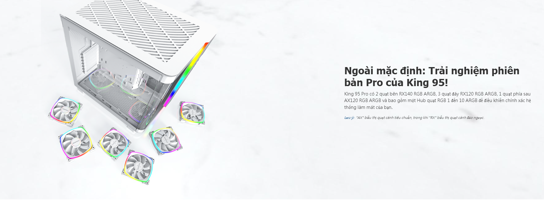 | (Các) Quạt được cài đặt sẵn | Bên: 140mm*2 (Quạt RGB ARGB đảo ngược)(Khả năng tương thích với GPU trở thành 275mm khi lắp đặt bộ làm mát bằng nước cao 63cm.) Đáy: 120mm*3(Quạt RGB ARGB đảo ngược) Ở phía sau: 120mm*1 (Quạt RGB ARGB) |