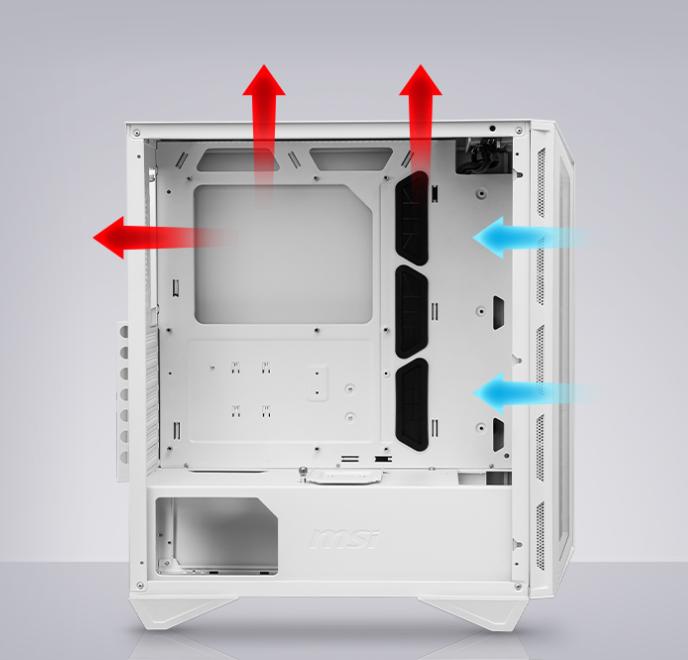 MPG GUNGNIR 110 Series được trang bị tốt để cung cấp luồng không khí hiệu quả nhất làm mát hệ thống. Dòng MPG GUNGNIR 110 đi kèm với 4 quạt và có 6 quạt.