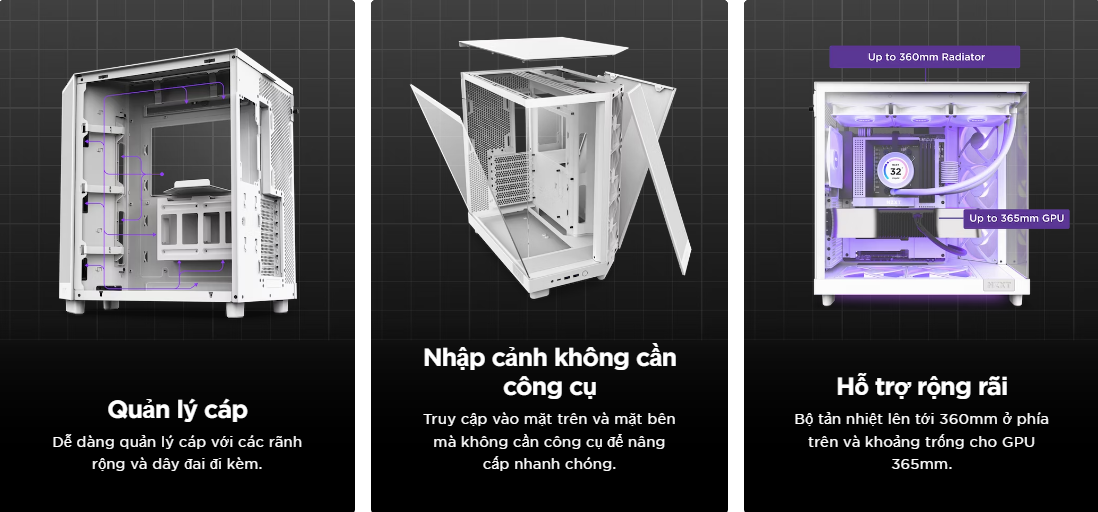 | Khả năng tương thích & Giải phóng mặt bằng | Chiều cao tản nhiệt CPU : 163 mm / 6,42 in Chiều dài GPU : 365 mm / 14,37 in Chiều dài PSU : 200 mm / 7,87 in Quản lý cáp : 91 mm / 3,58 in Bộ tản nhiệt phía trên : 30 mm / 1,18 in |