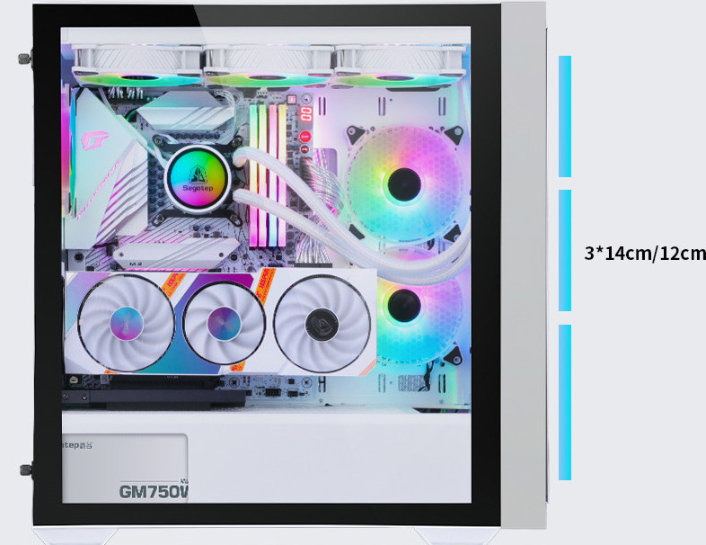 | Hỗ trợ tản nhiệt | Mặt trước: 12cm * 3 / 14cm * 3 (hỗ trợ 240mm / 280/360 làm mát bằng nước) Trên cùng: 12,3 / 14cm.2 (hỗ trợ 240mm / 280/360 làm mát bằng nước) Phía sau: 12cm. Bên trong: 12cm * 2 Nắp đậy PSU: 12cm * 2 |
