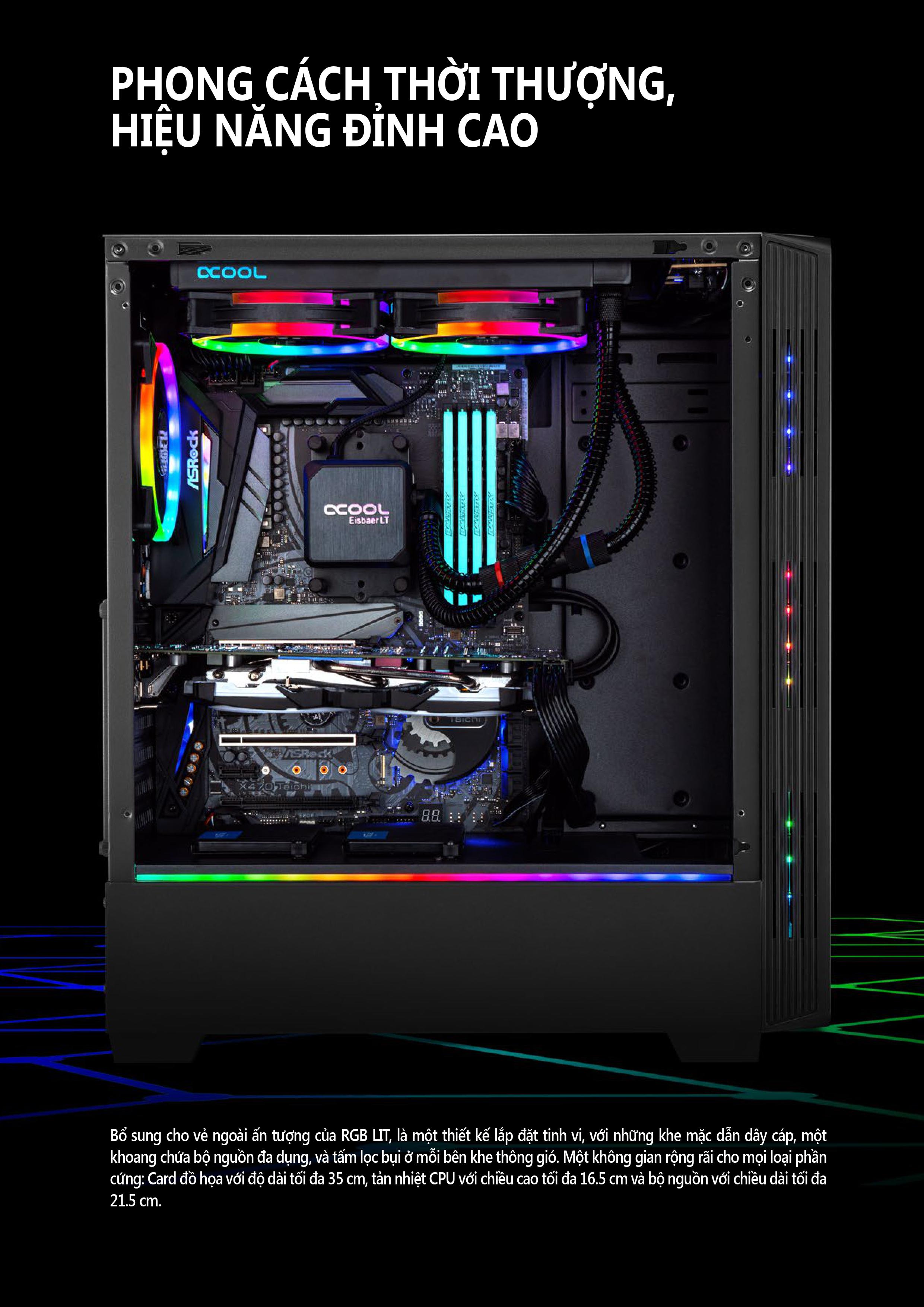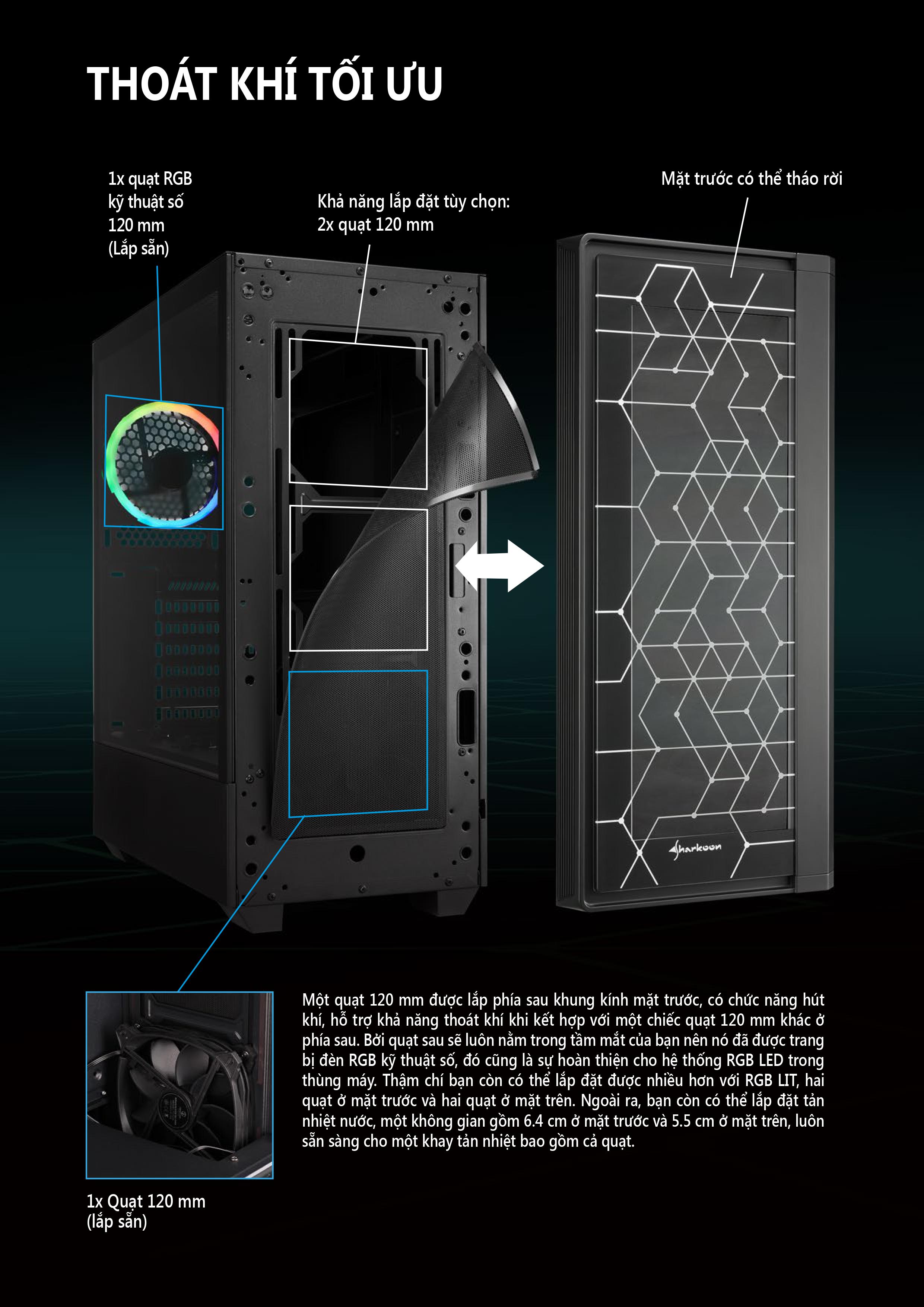 | Cấu hình quạt | Bảng điều khiển phía trước: Quạt 1x 120 mm (được cài đặt sẵn) hoặc quạt 2x 120 mm (tùy chọn) hoặc bộ tản nhiệt (tùy chọn) Bảng điều khiển phía sau: Quạt RGB có địa chỉ 1x 120 mm (Cài đặt sẵn) Bảng điều khiển trên cùng: Quạt 2x 120 mm hoặc quạt hoặc bộ tản nhiệt 2x 140 mm (tùy chọn) |