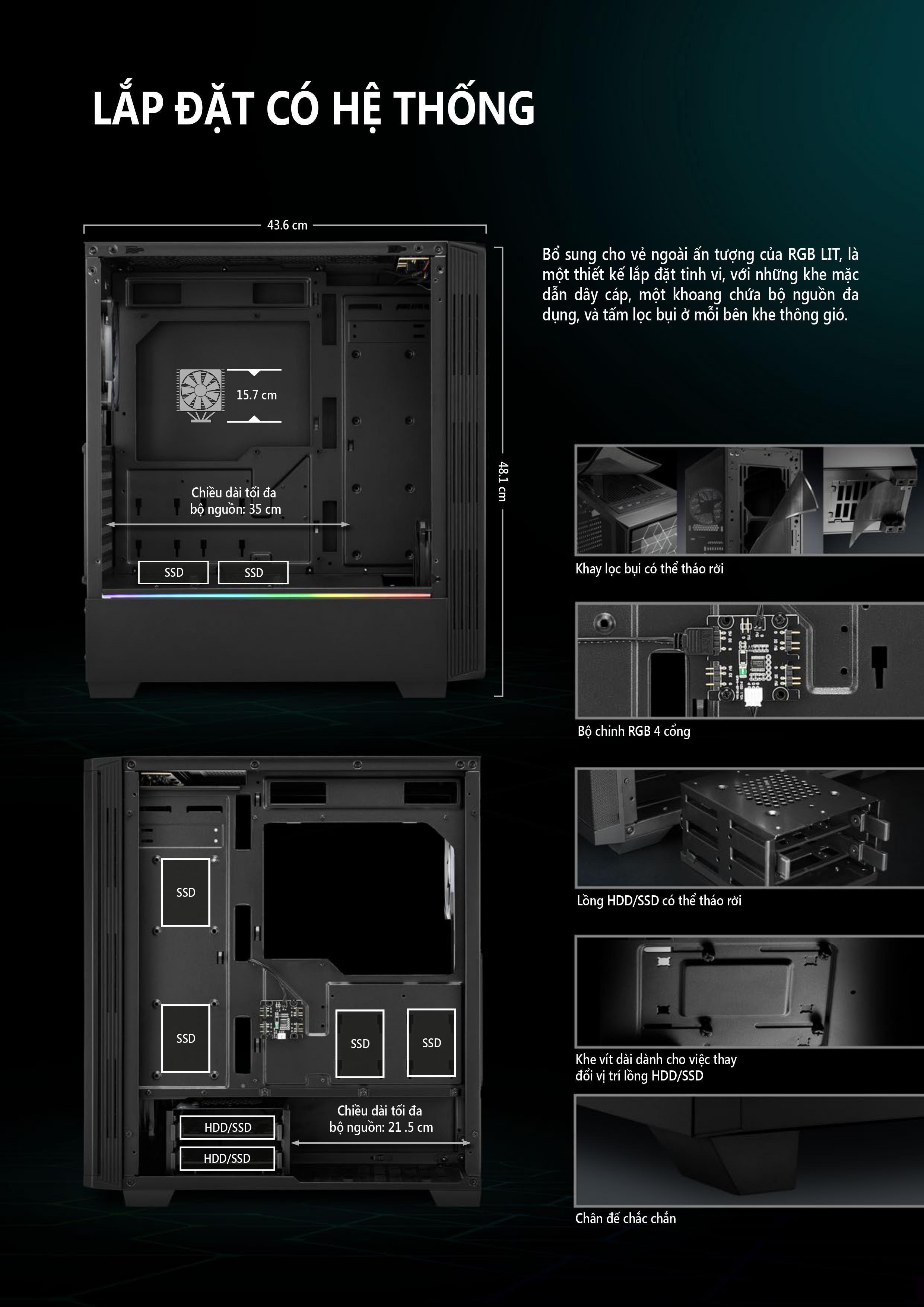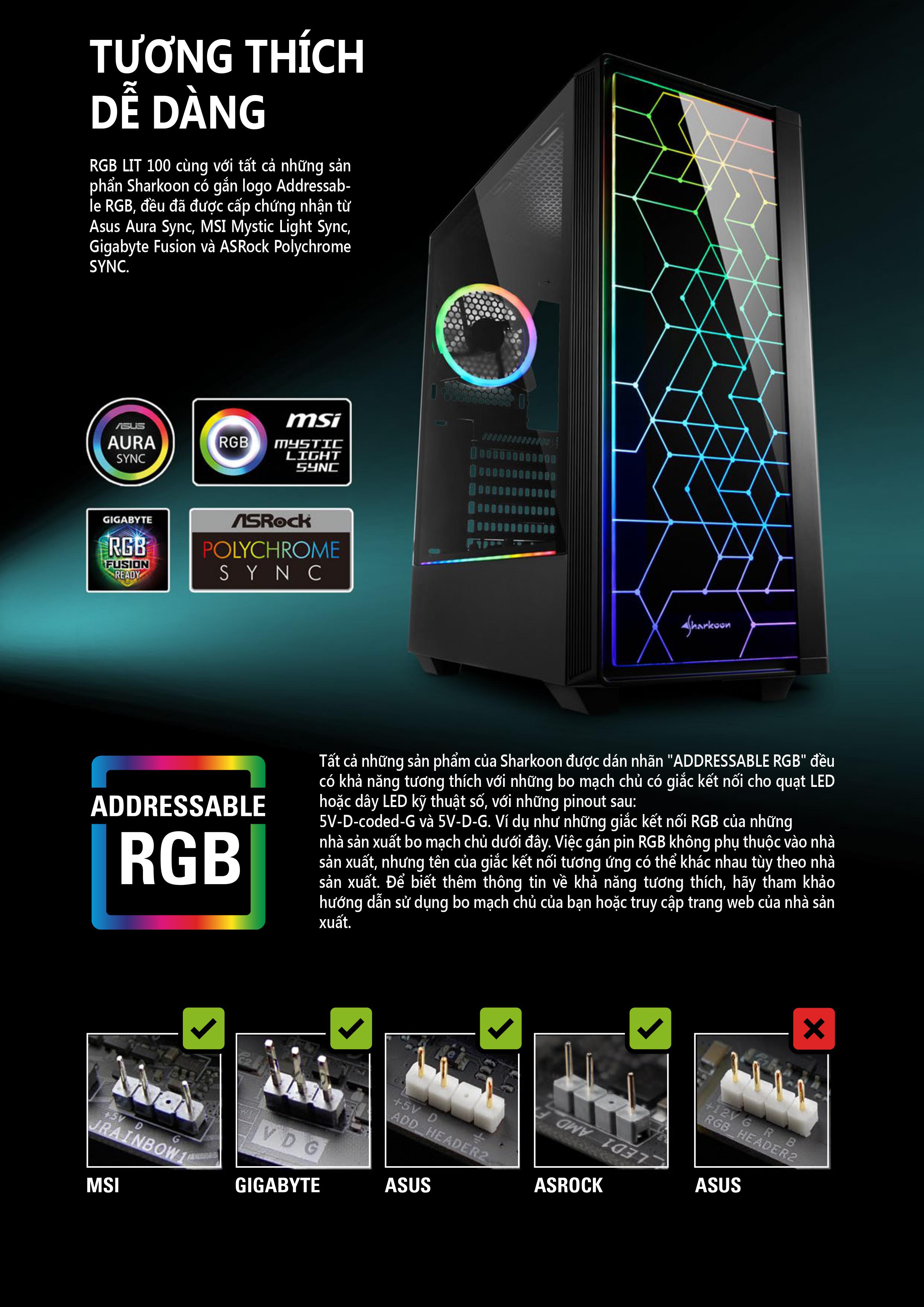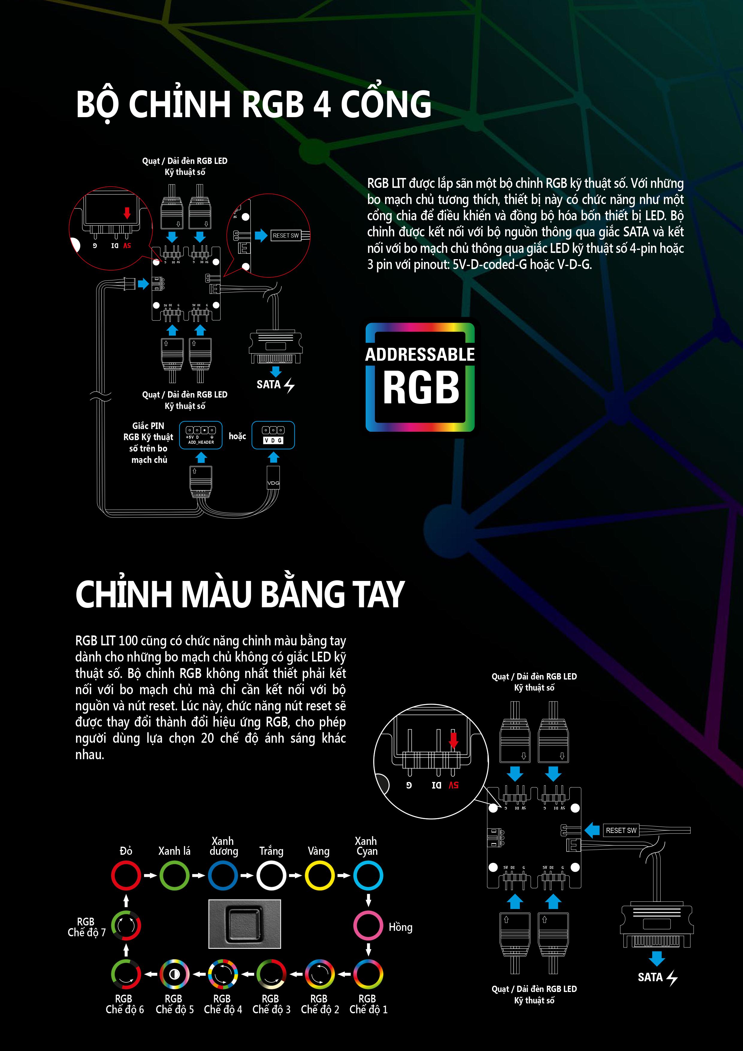 | Khả năng tương thích RGB | Loại hình: Địa chỉ Các cổng: 4 Kiểm soát thủ công: 14 chế độ Khả năng tương thích của bo mạch chủ: MSI Mystic Light Sync, ASUS Aura Sync, Gigabyte RGB Fusion Ready, ASRock Polychrome Sync Sơ đồ chân RGB: 5V-DG & 5V-D-mã hóa-G |
